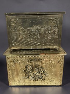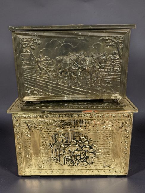Two embossed brass coal boxes, the larger 46 cm wide.