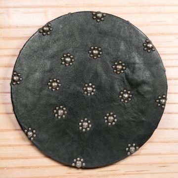 A reproduction Scottish shield / targe covered in black leather with metal studs, diameter 46 cm.