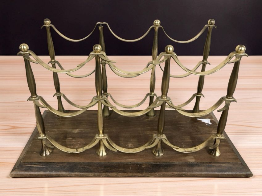 A brass bottle rack on wooden plinth, width 49 cm.