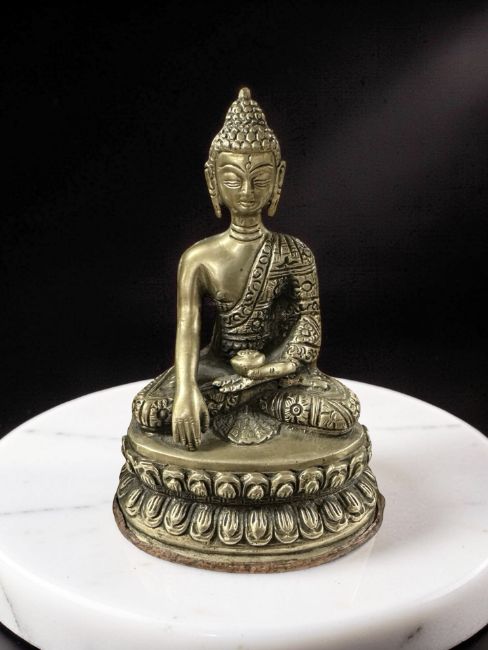 A cast patinated metal figure of Buddha seated in lotus pose, height 15 cm.