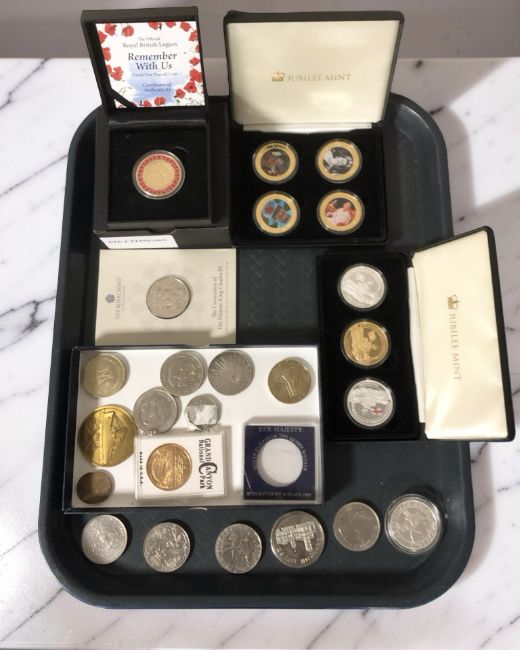 A collection of mainly crown sized coins including a set of three Jubilee Mint RNLI five pound coins, jubilee crowns, etc.