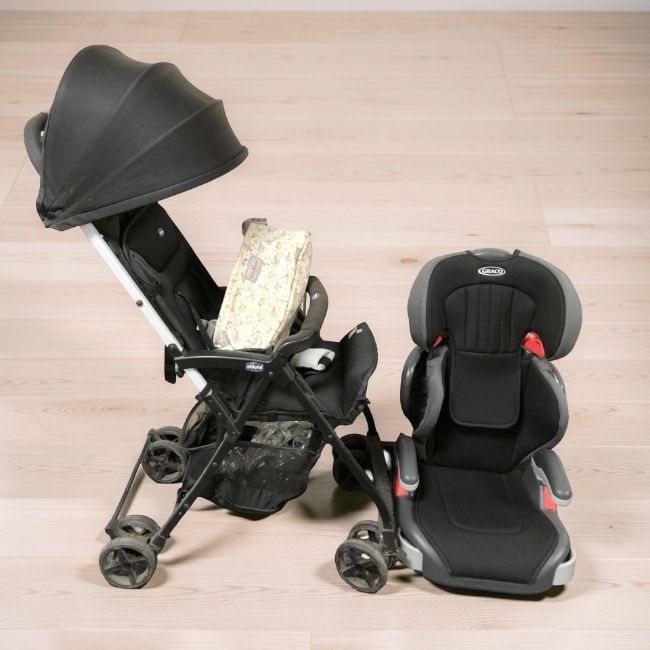 A Chicco lightweight folding pushchair with rain cover, and a Cath Kidston push chair caddy, together with a Graco car booster seat.