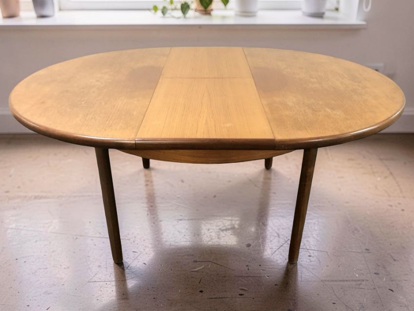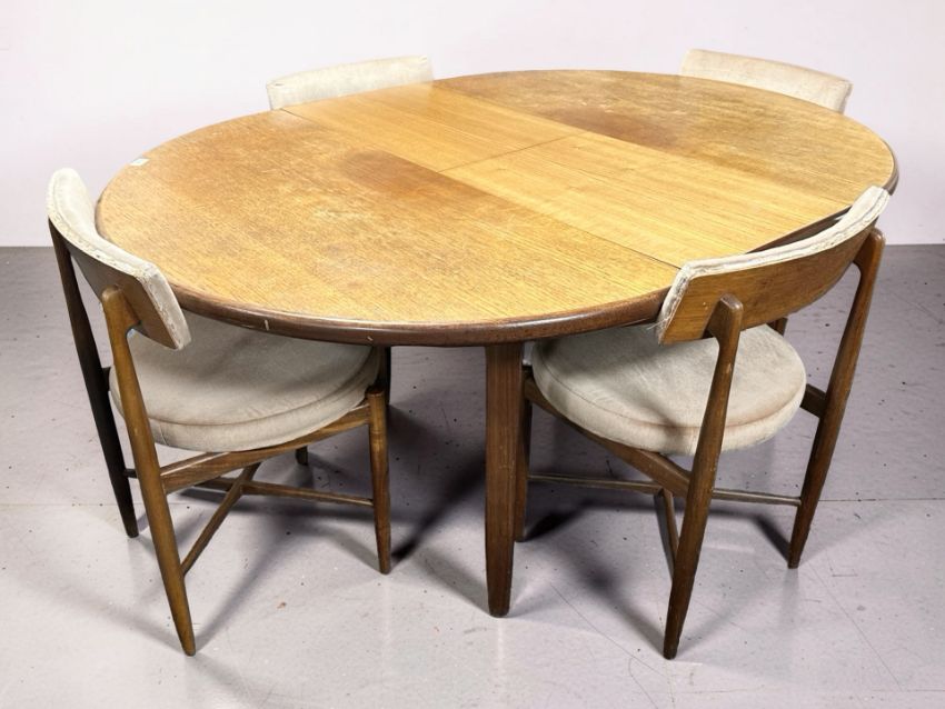 A 20th century G-Plan teak oval extending dining table, 163 cm x 124 cm x 72 cm (extended), together with a set of four dining chairs in peach upholstery.