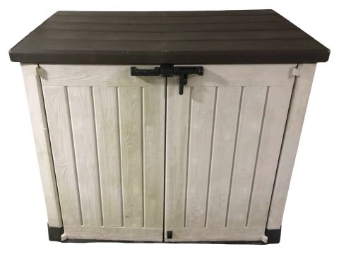 A Keter plastic garden storage box, 145 cm x 83 cm x 120 cm.