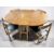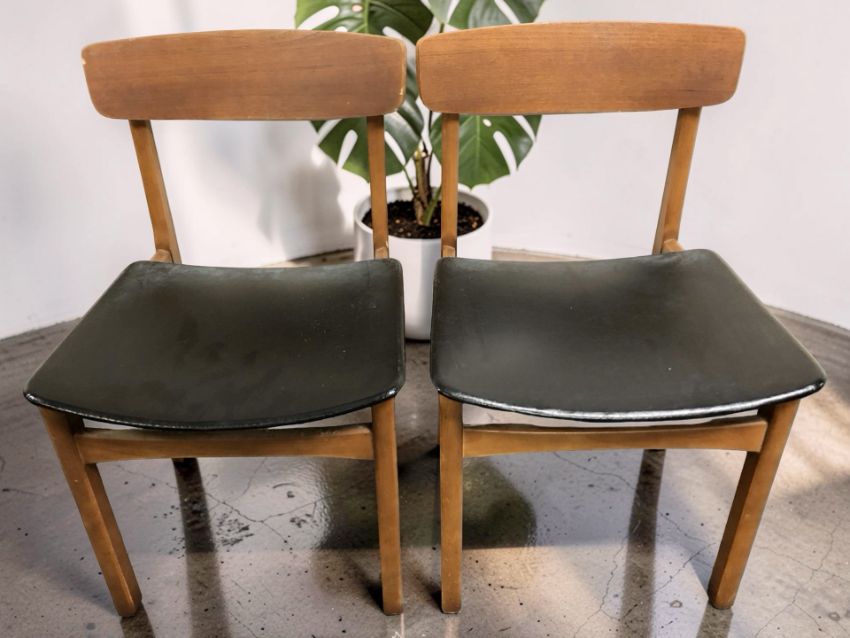 A 1960's teak gateleg drop leaf oval dining table, 148 cm x 114 cm x 73 cm, together with a set of four bent and laminated teak and black vinyl dining chairs.