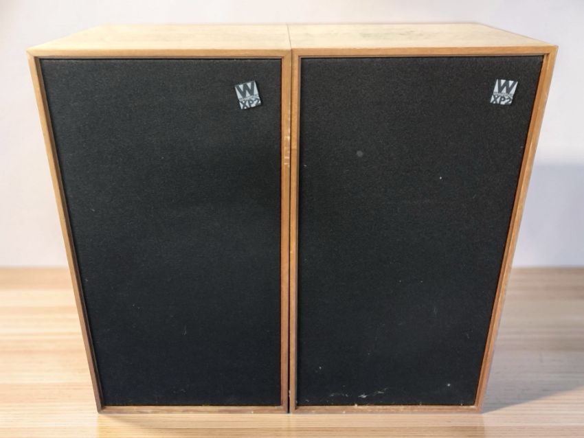 A pair of Wharfedale XP2 teak cased speakers, height 57 cm.