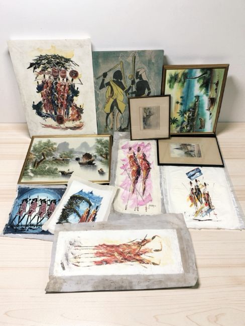 A group of pictures and prints, oriental oil on canvas depicting fishing boats, 19th century engraving of Holy Island, other unframed pictures, etc. (1 box)