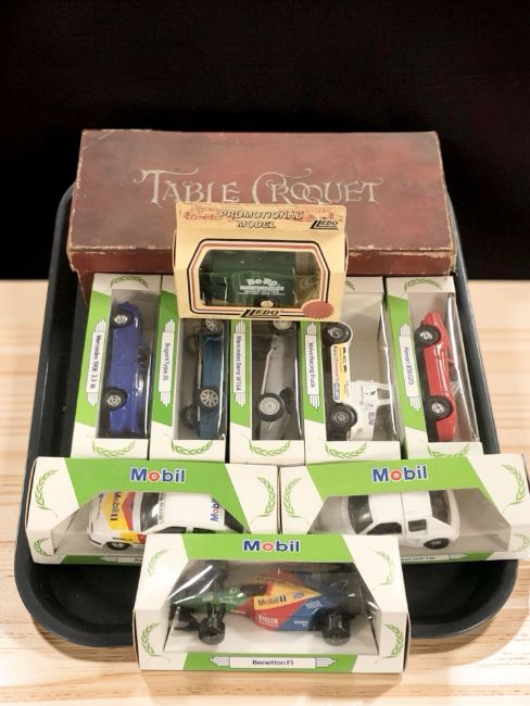 A group of Lledo and Corgi boxed die cast vehicles, a table croquet set, etc.