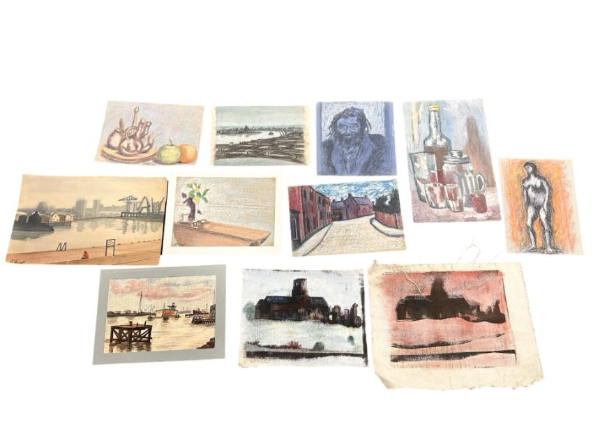 Ken Stewart (Jarrow Artist, 1926-1991) : Eleven unframed works including oil on board still life of bottles and glasses, 46 cm x 29 cm, portrait studies, industrial landscapes, pastel studies, etc.