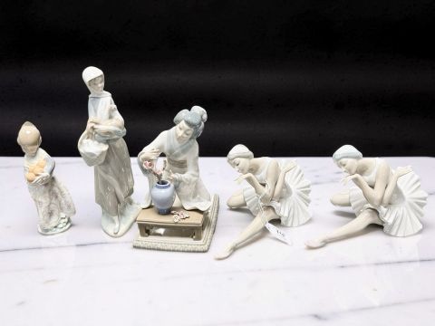 One ballerina with restored hand, geisha figure with piece loose from flowers.