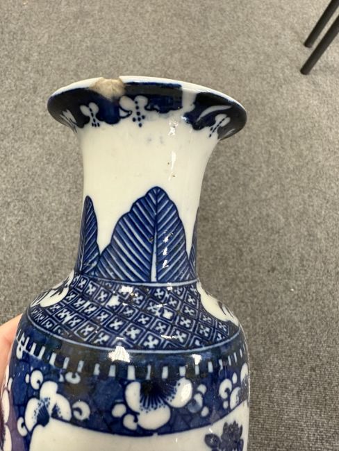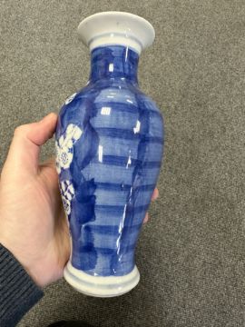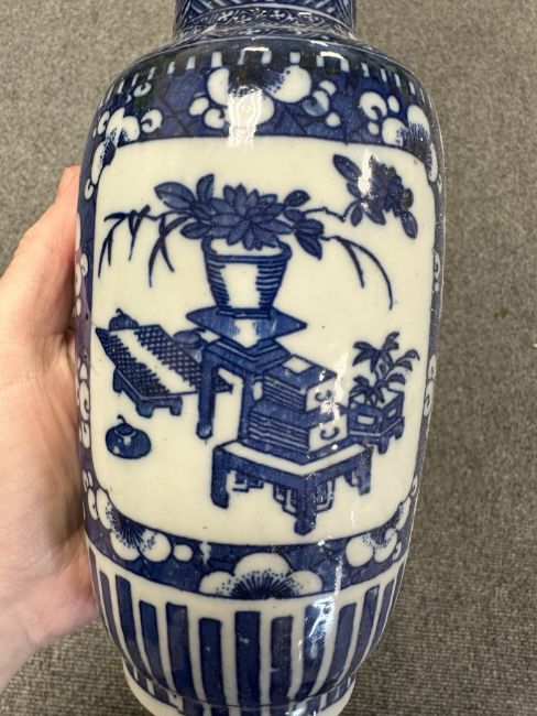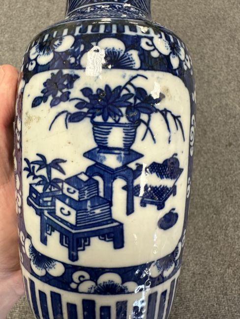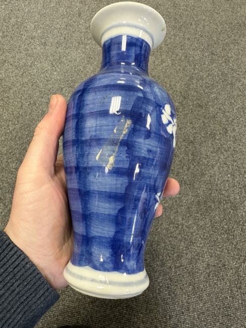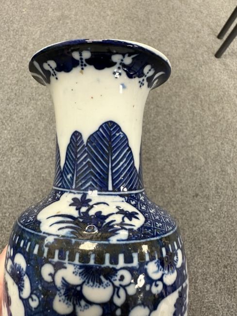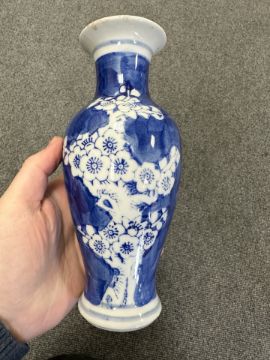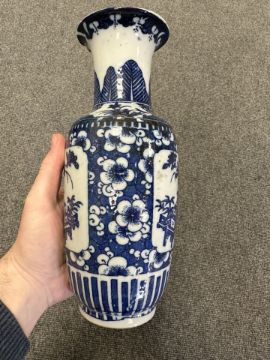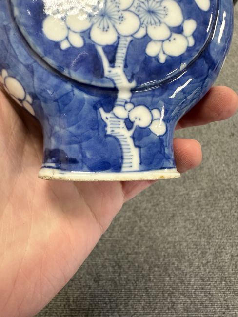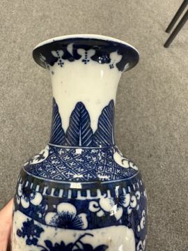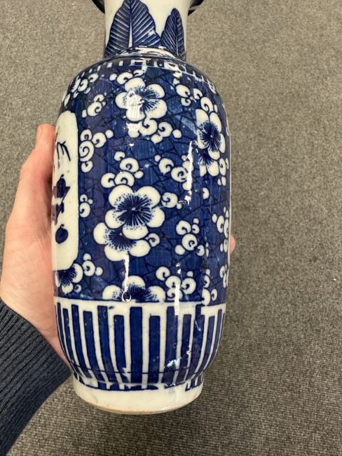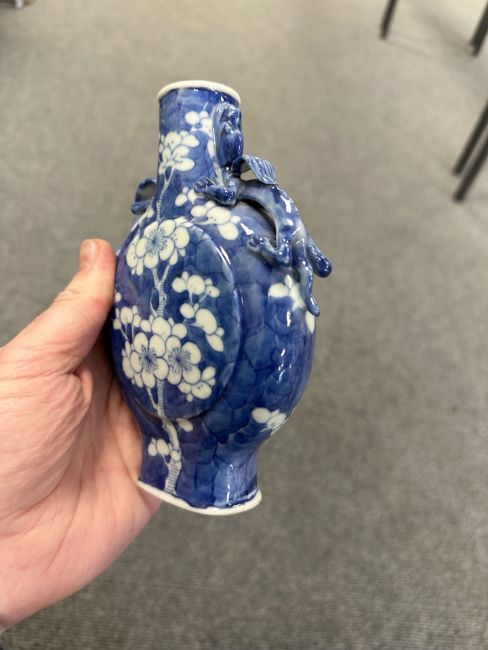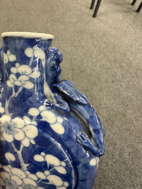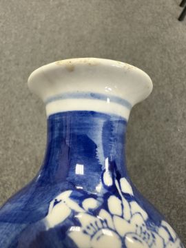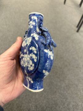 A Chinese blue and white porcelain vase, with four character Xuande reign mark to base in underglaze blue, together with three further baluster vases and a moon flask vase decorated with prunus on cracked ice ground.