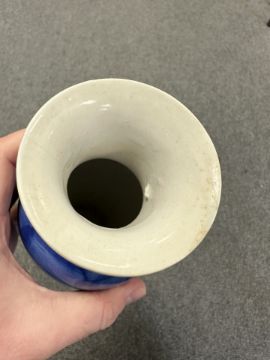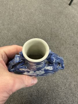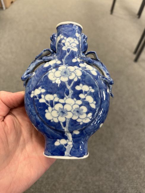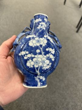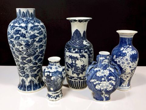 First vase with minor abrasions to the glaze around the rim and foot but otherwise appears good. Second vase with large chip to rim. Third vase with faint hairline to rim. Fourth vase with numerous chips around base. Moon flask vase with small firing crack at the foot. See numerous additional images.
