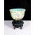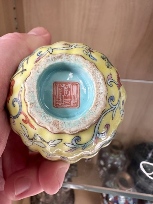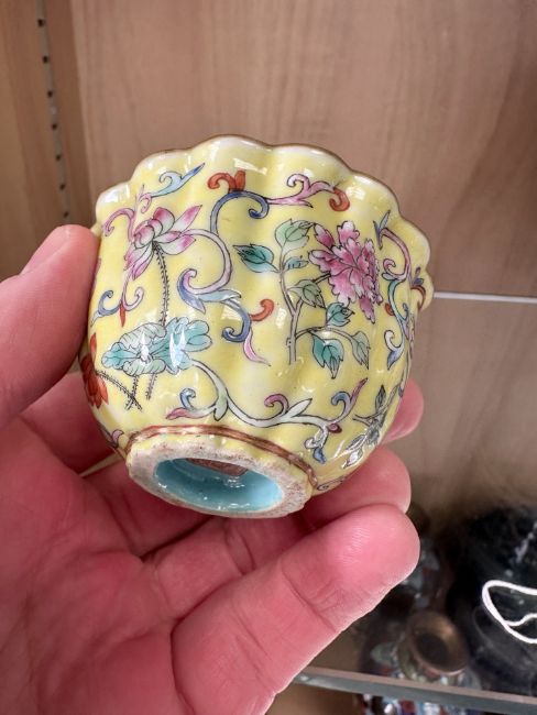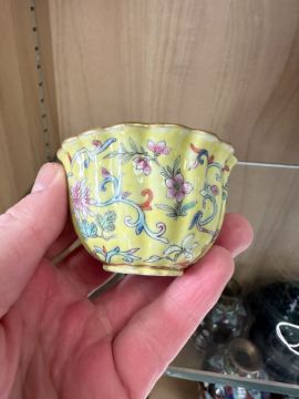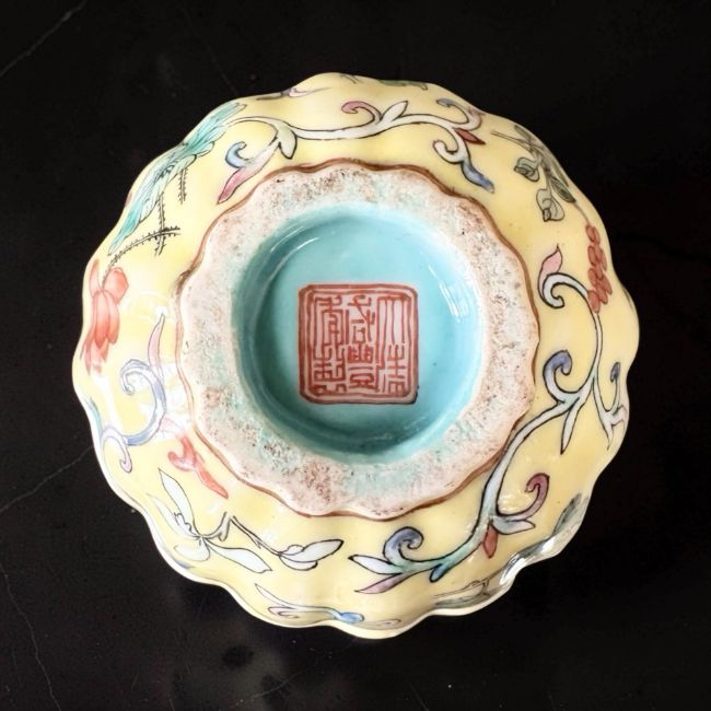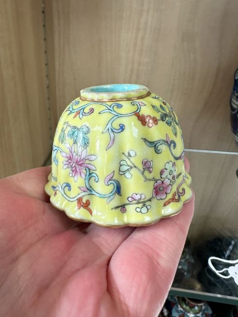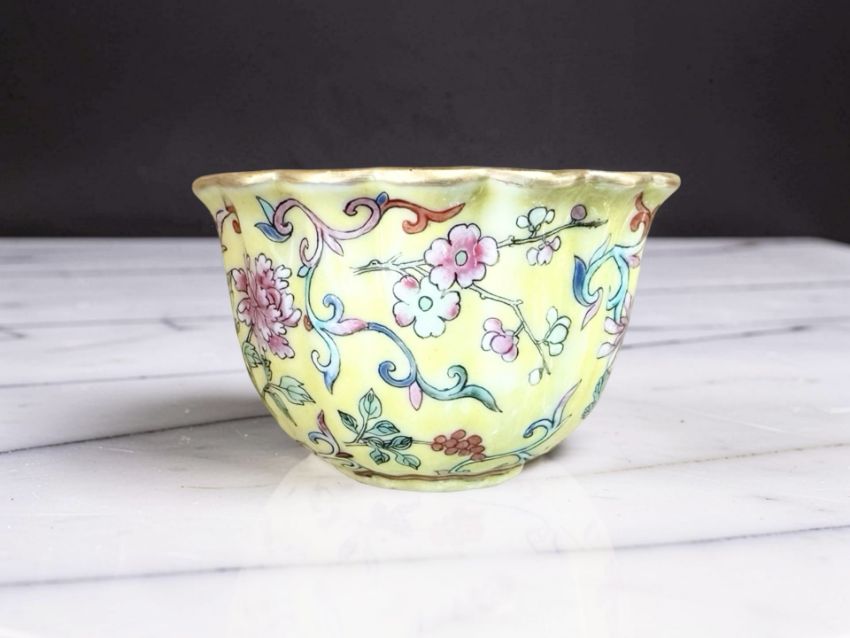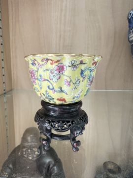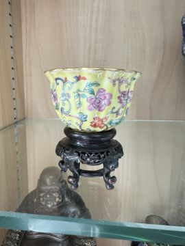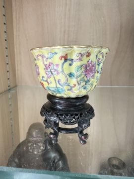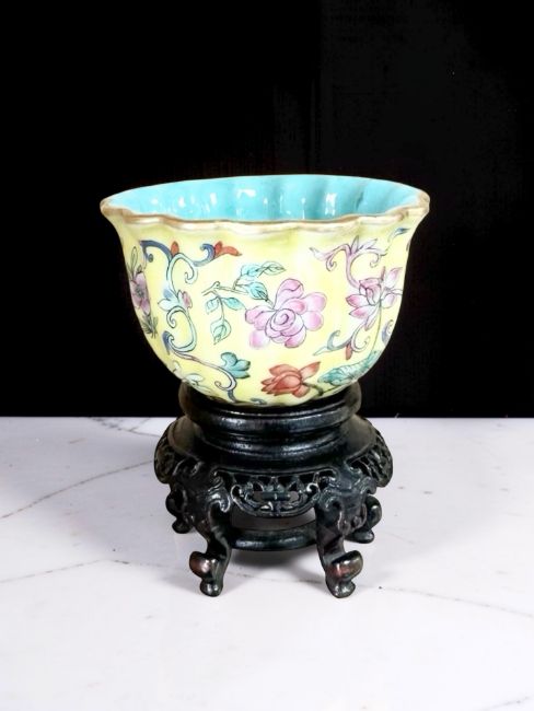 A Chinese famille rose yellow-ground cup, Qing Dynasty, six character Xianfeng mark and possibly of the period, the body painted with blossom sprays and foliage on a bright yellow ground, the recessed base and interior decorated with turquoise enamels, together with a wooden stand, 7cm diameter.