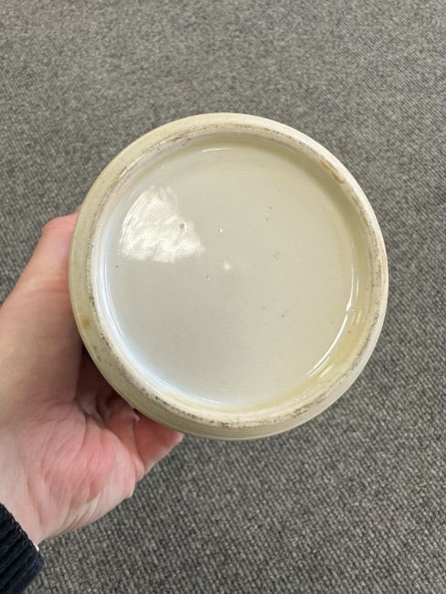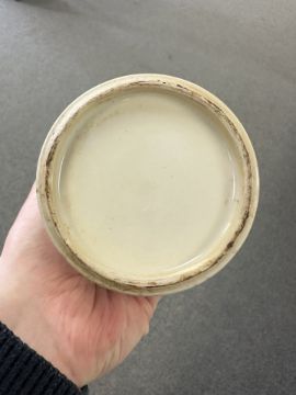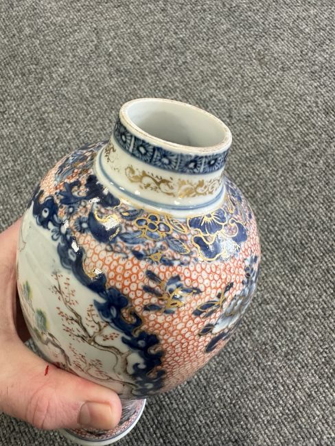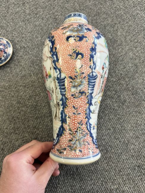 Vase lacking cover has an old repaired chip to the rim. Second vase appears to be in good condition. Both have typical minor surface wear. See numerous additional images.
