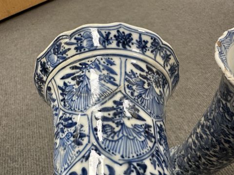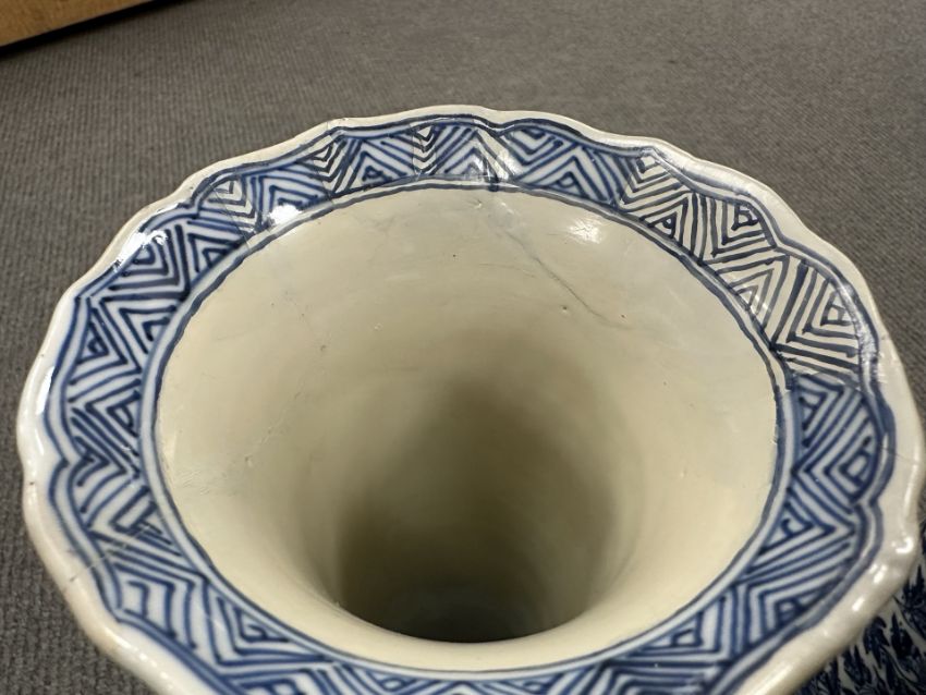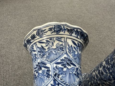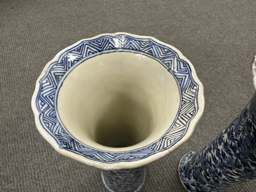 Both with chips and hairline cracks around the rims. One vase with large section of rim restored.