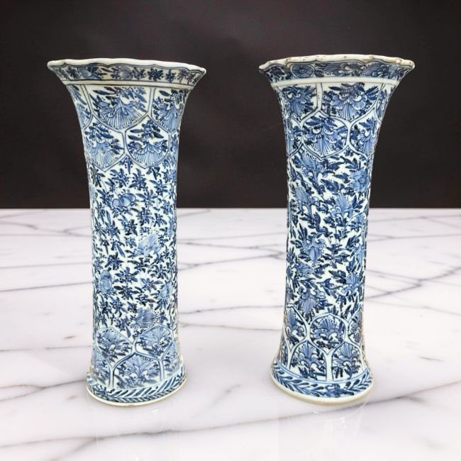 A pair of Chinese blue and white porcelain sleeve vases, Kangxi period, of flared trumpet form, painted in underglaze blue with flowing flowers and vines, height 26cm.