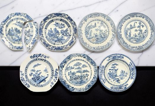 Seven various Chinese blue and white porcelain plates / shallow bowls, Qianlong, 18th century, each approximately 23 cm diameter. * Provenance - The Michael Trethewey Collection, sold David Lay Auctioneers, 12th August 2021.