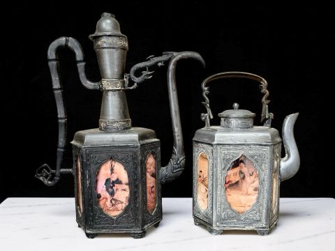Two Chinese pewter and glass panelled teapots, Qing Dynasty, tallest 29 cm.