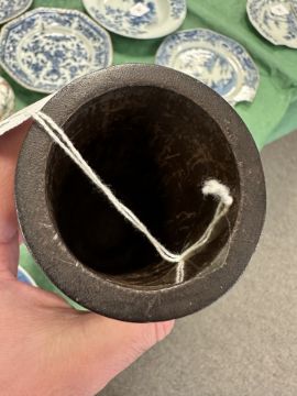 Only one pot is bamboo, the other is some kind of hardwood. Bamboo pot with natural split near the bottom. Otherwise the lot appears to be in good condition. See numerous additional images.