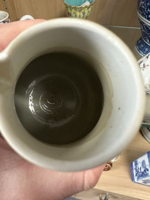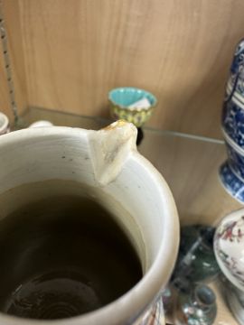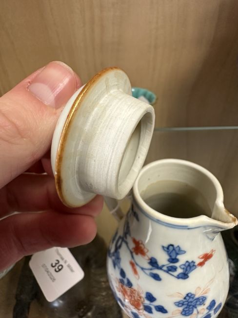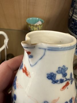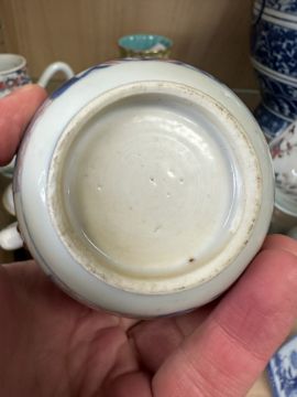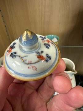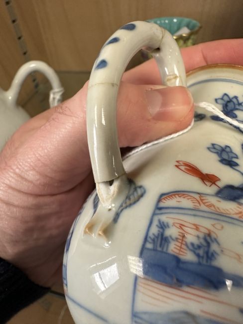 Hairline cracks and restoration to handle. Chips to beak of jug. Cover appears good. Minor surface wear and glazing bubbles. See numerous additional images.