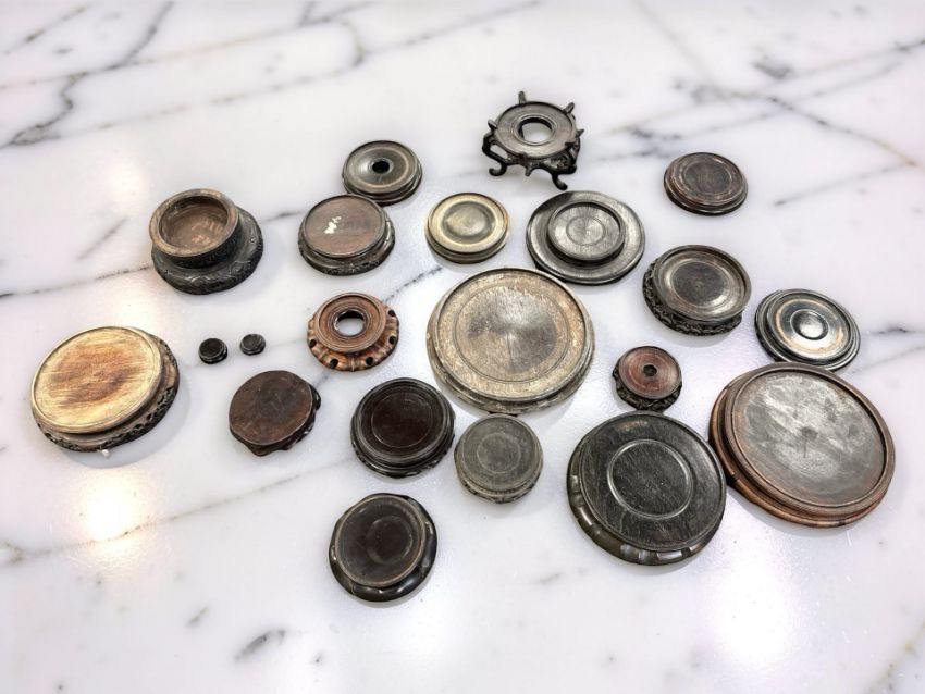 Twenty one Chinese carved hardwood stands for vases and figures, largest diameter 29 cm.