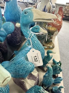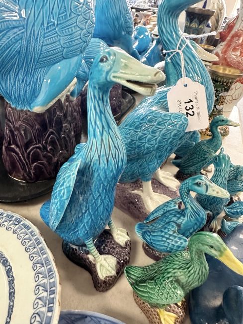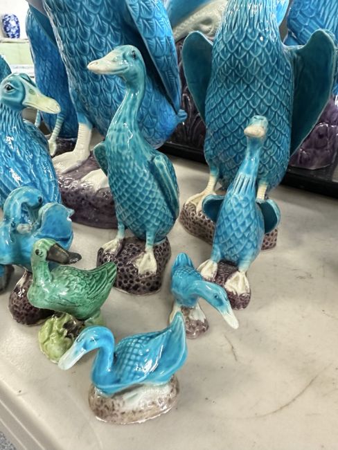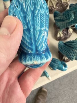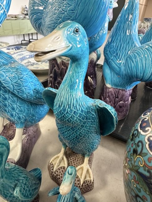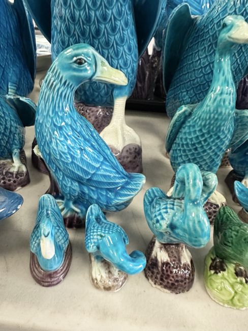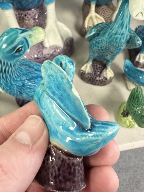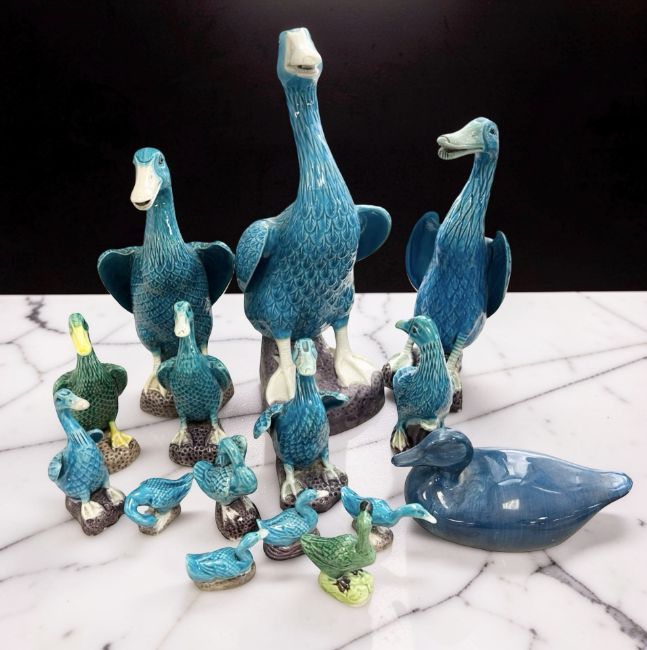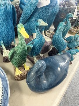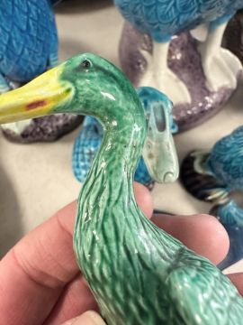 Green duck with restored neck. Another duck with small chip to tail feathers. Duck with raised wing has small chip to edge. Otherwise good condition. See additional images.