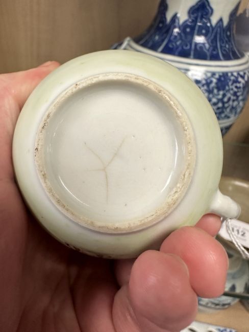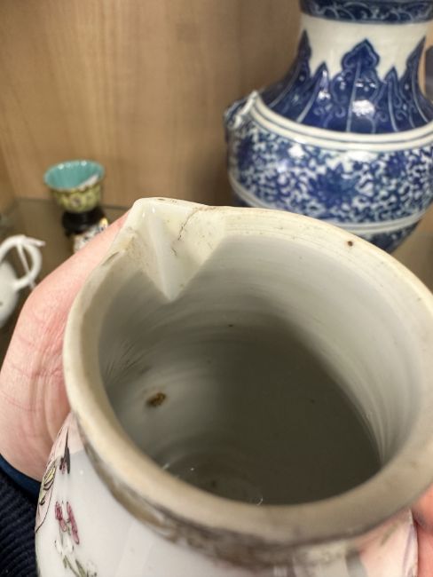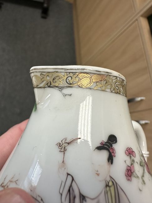 Typical surface wear to gilding and enamel. Faint hairline crack at the base of the handle. Firing crack to 'beak' of jug, and another in the base. Small rough patch of exposed pottery next to the beak, where some of the glaze has flaked off. See numerous additional images.