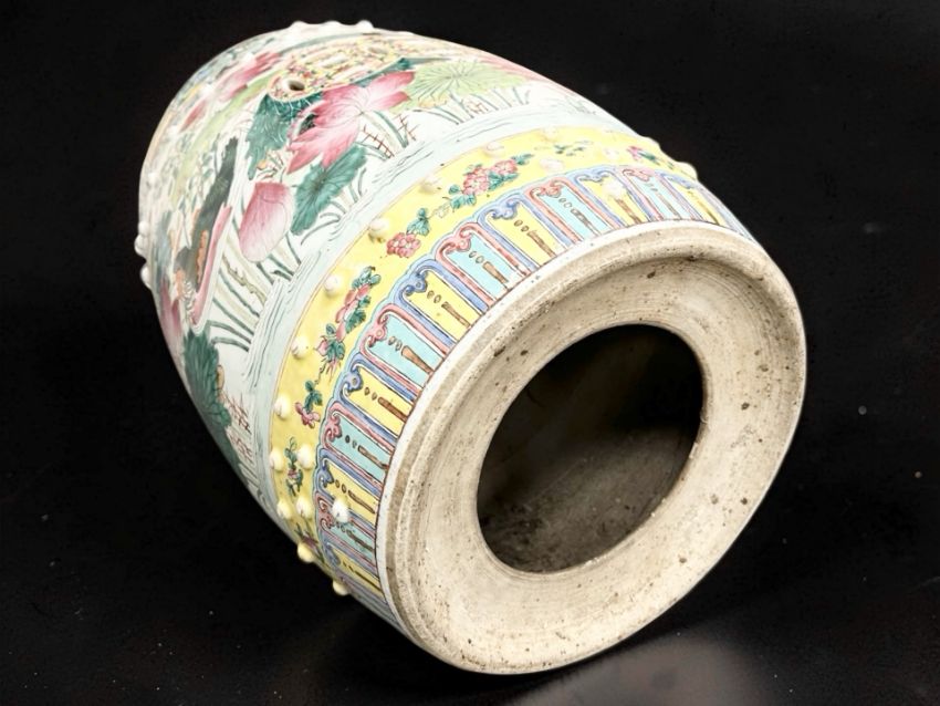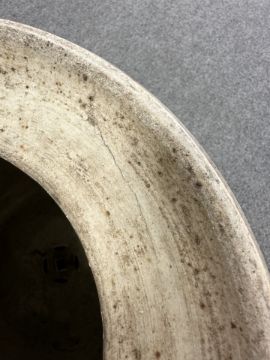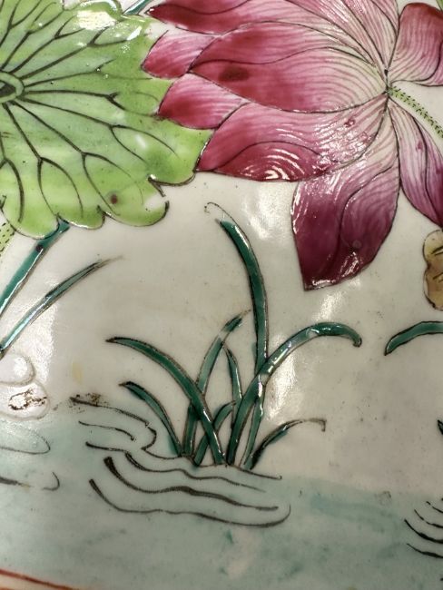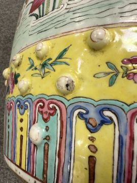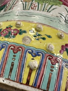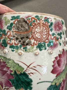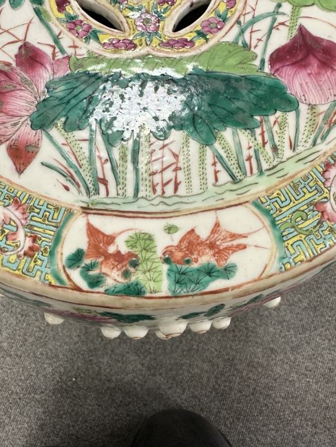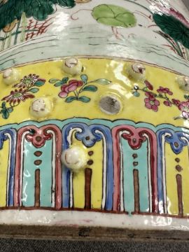 Typical surface wear to enamel and gilding. Damage to three of the raised beads - one with large chip, another broken off completely, and the third with a smaller chip. Underside with a small firing crack. Small losses to some areas of enamel (see close ups). Otherwise appears to be in good condition. No obvious cracks or signs of restoration. See numerous additional images.