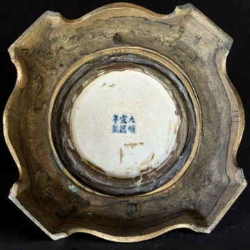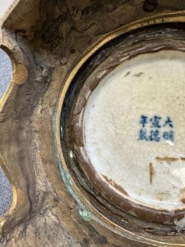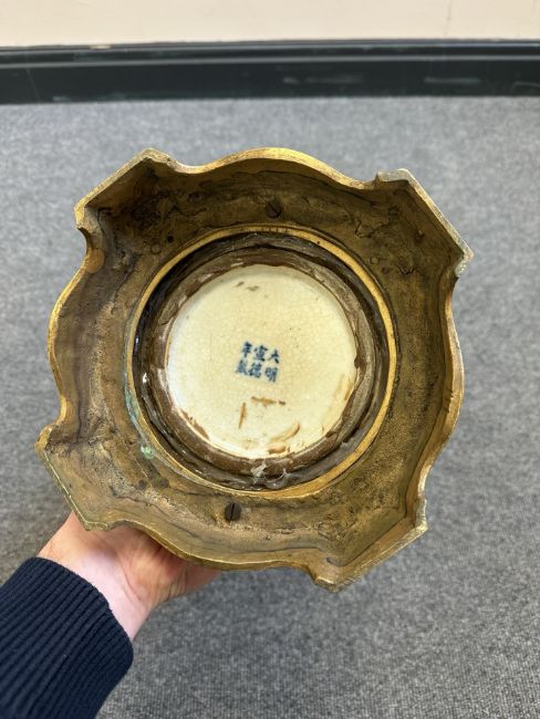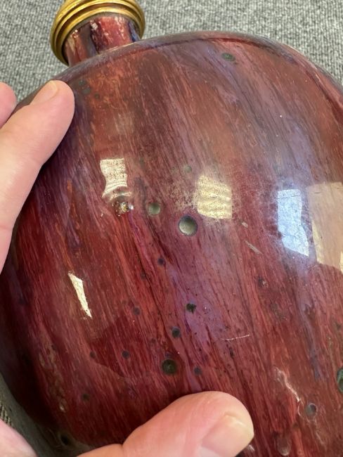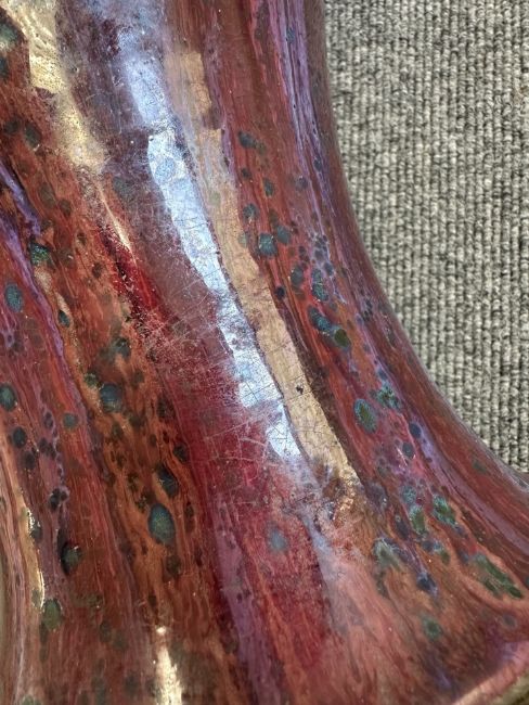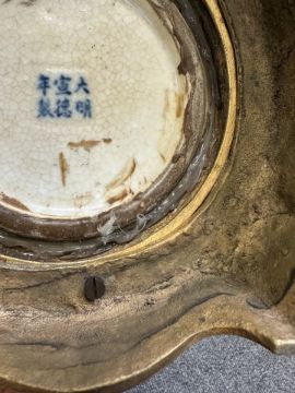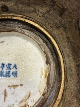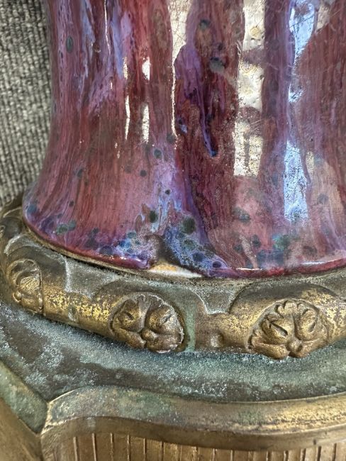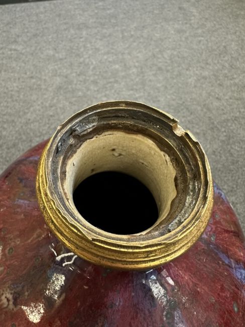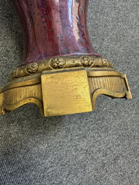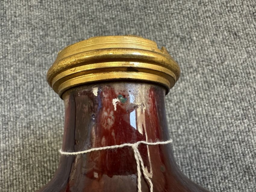 Typical glazing bubbles and other small flaws. Crazing all over body. Fairly recent glue around the base, suggesting the ormolu mount has become detached but was then reattached. The vase does not appear to have been drilled. See numerous additional images.