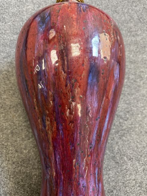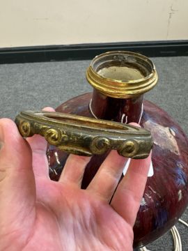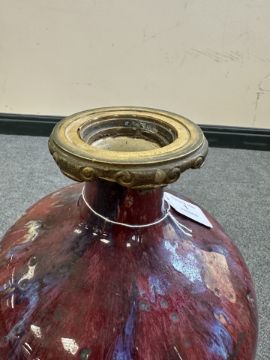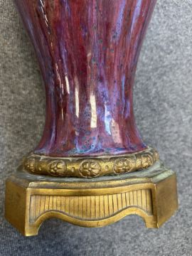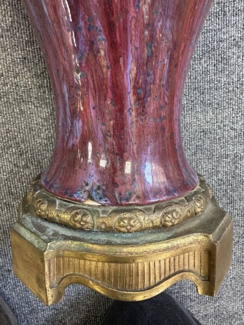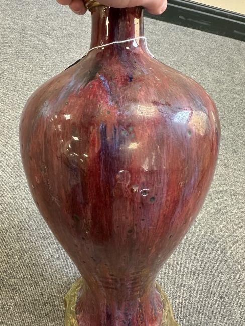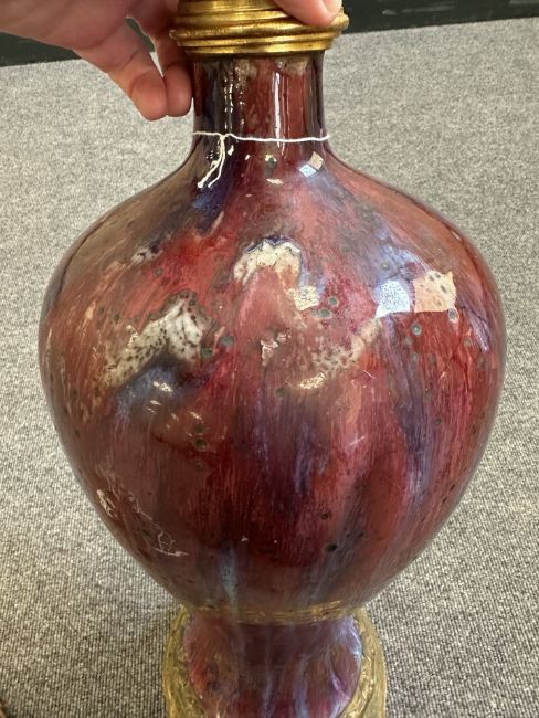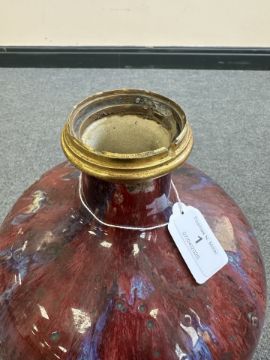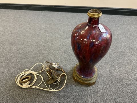 A Chinese Sang de Boeuf porcelain baluster vase, 19th century, converted to a table lamp, with later European ormolu mounts to base and collar, overall 52 cm high.