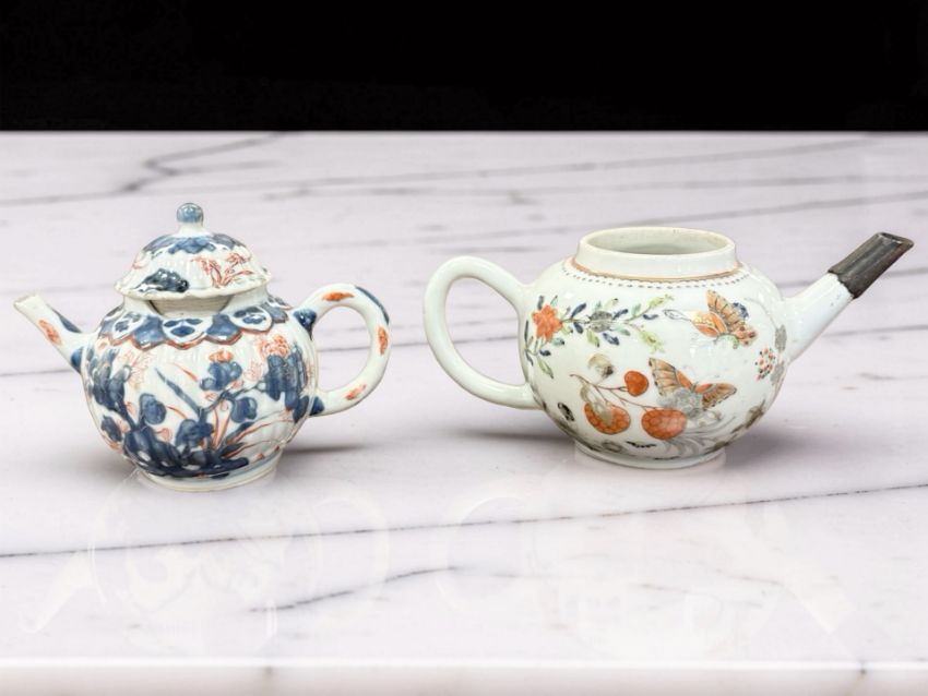 A Chinese porcelain bullet teapot, Qianlong, 18th century, hand painted in polychrome enamels, lacking cover, height 9 cm, together with a further Chinese Imari ribbed bulbous teapot and cover, 18th century.
