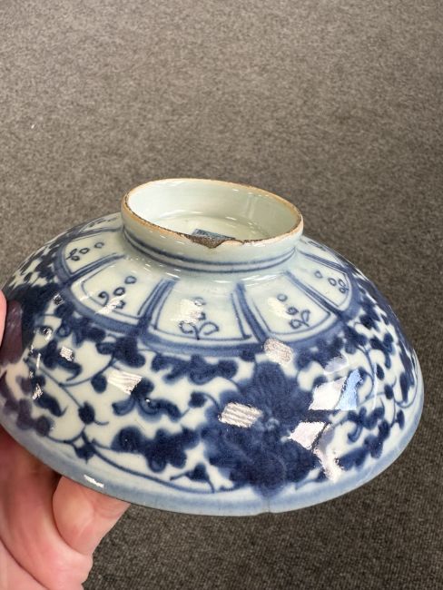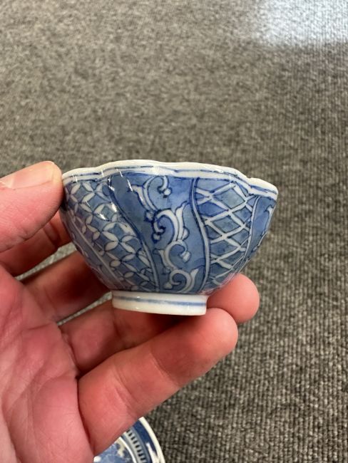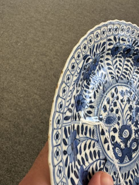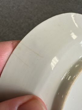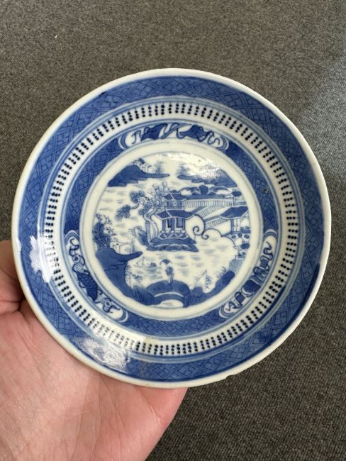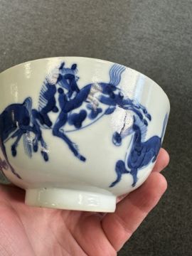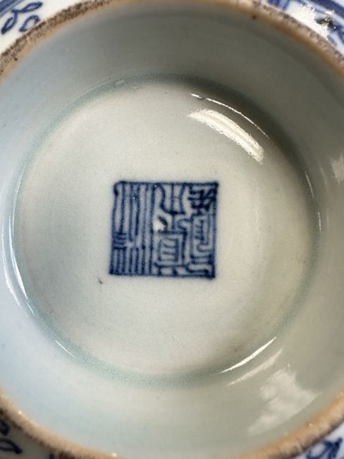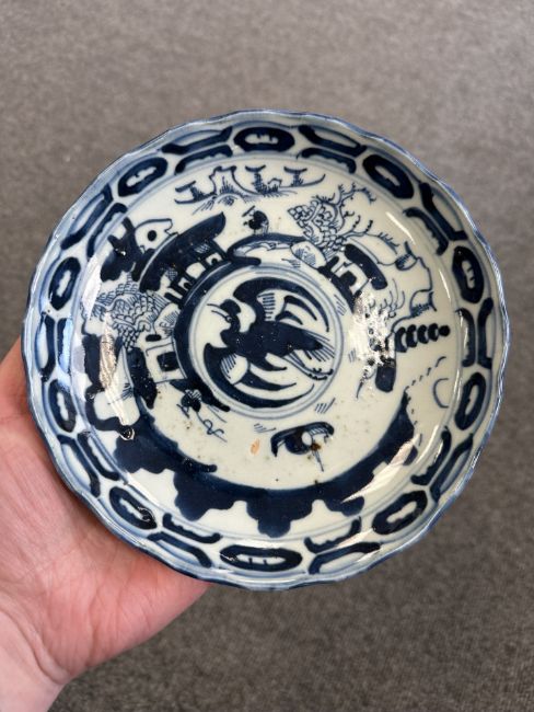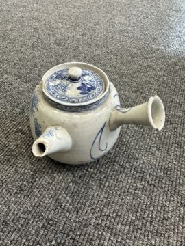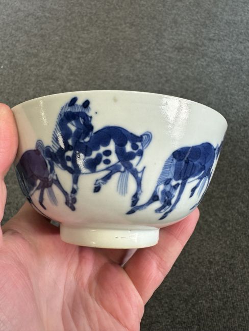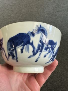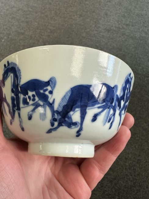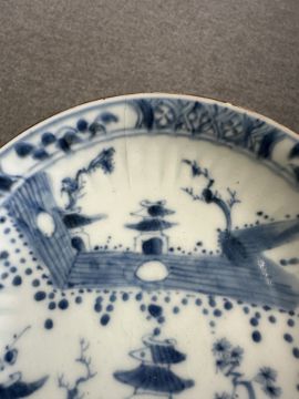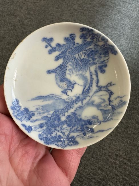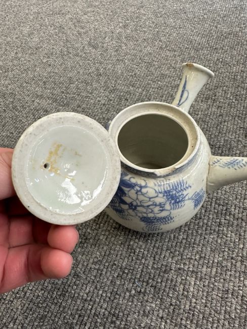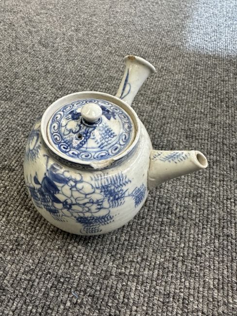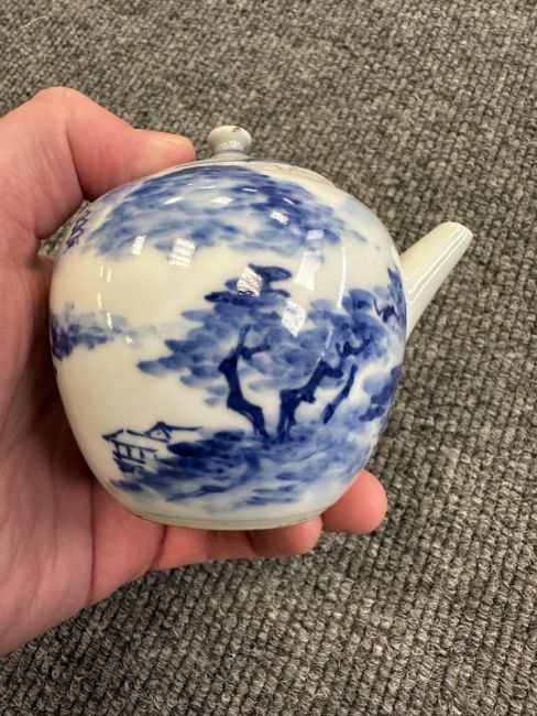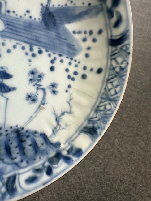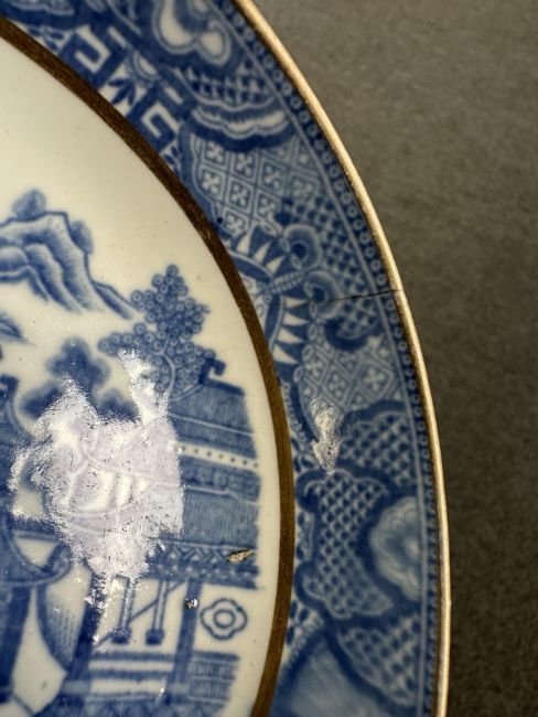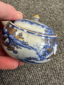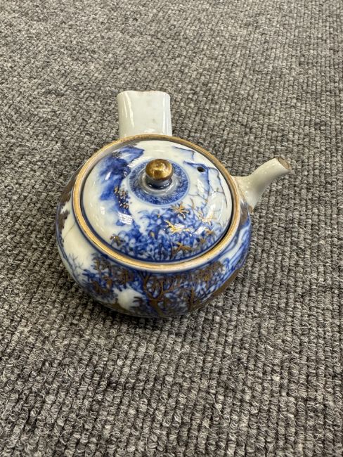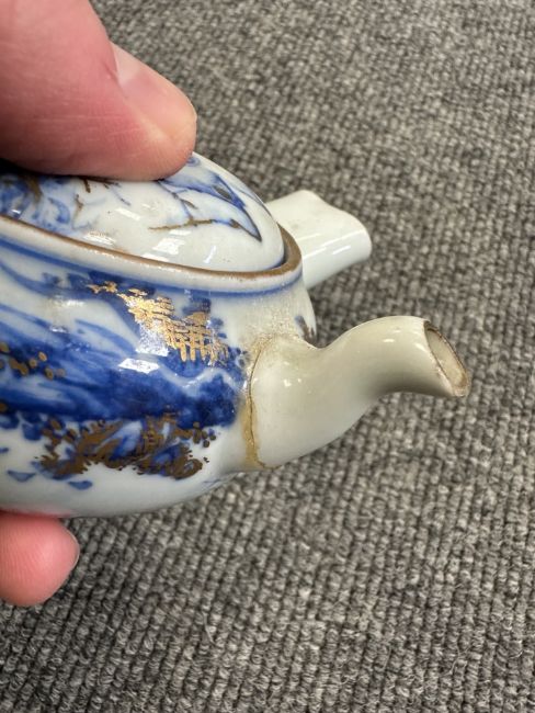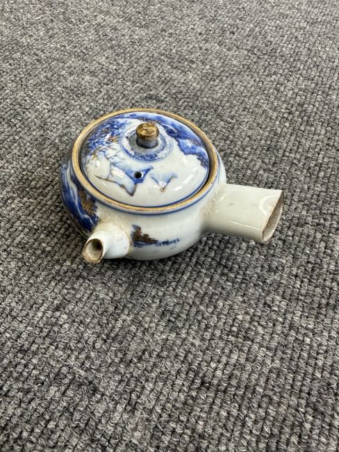 Blue and white floral plate with small chips to rim. Saucer depicting a pagoda with hairline cracks. Blue and white dish with central bird appears undamaged. Teapots all with various small chips, one with restored spout and large hairline crack. Tea bowl with small chip to rim. Saucer depicting bird of prey appears undamaged. Blue and white plate depicting pagodas with figure on a bridge - chip to edge and small hairline cracks. Horses tea bowl appears undamaged. 20th century tea bowl appears undamaged. Gilt rimmed plate with hairline crack and star crack to reverse. Final footed bowl with chips and hairlines. See numerous additional images.