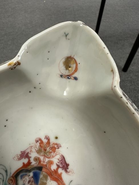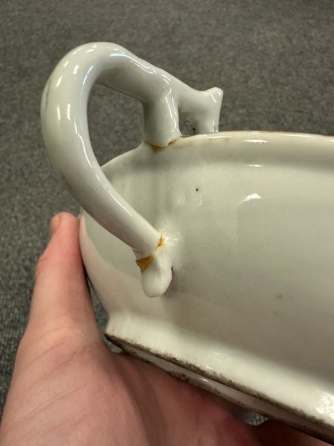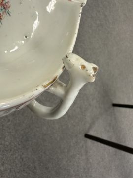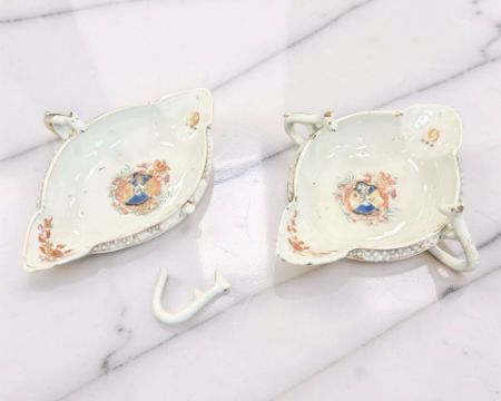 Both with damages to the handles, one handle broken off but piece is present. Firing flaws, small chips and surface wear. See numerous additional images.