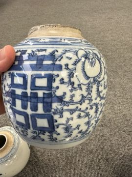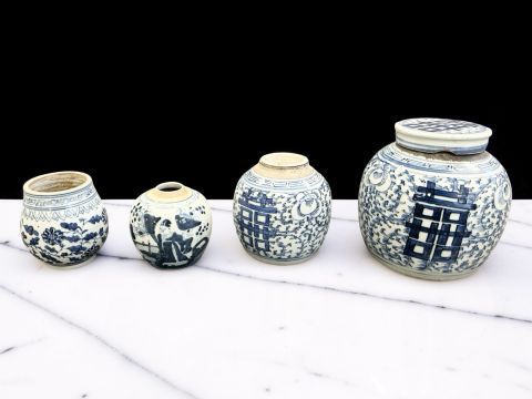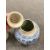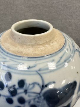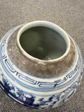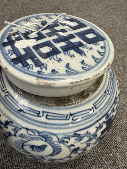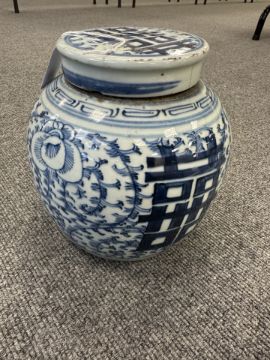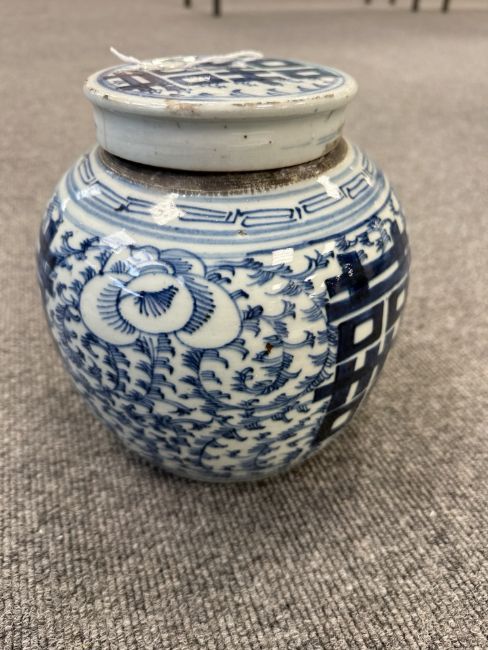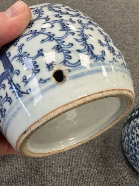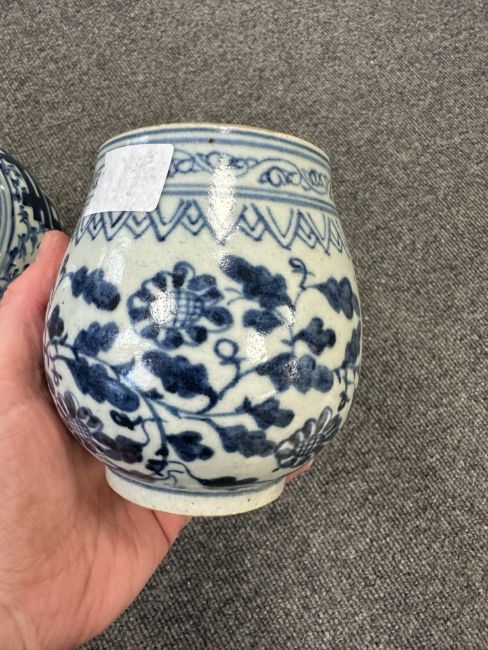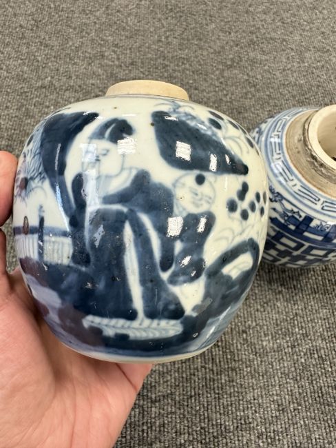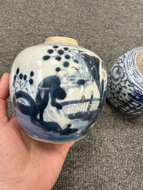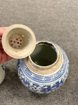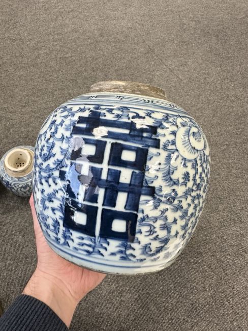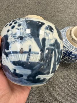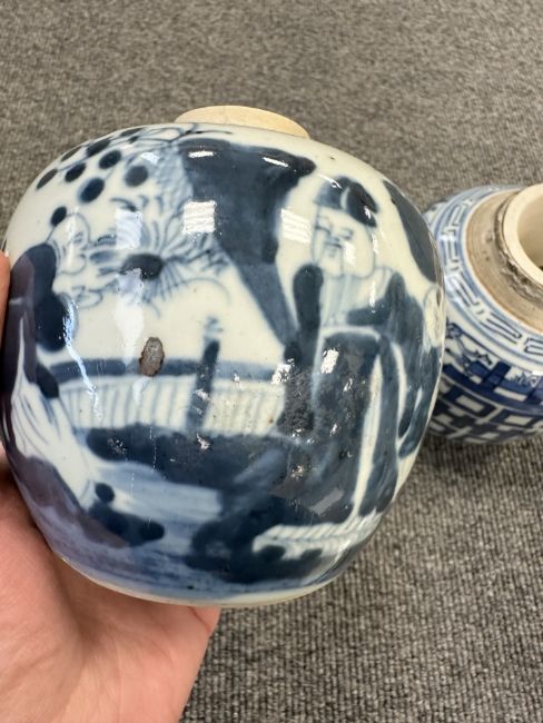 Largest urn with chips to lid, rim and base. Other urn lacking lid and drilled to lower body. Bulbous pot with large glazing flaw to middle of body, another flaw to the upper body and a small hairline to the rim. Other pot appears to be in good condition. See numerous additional images.
