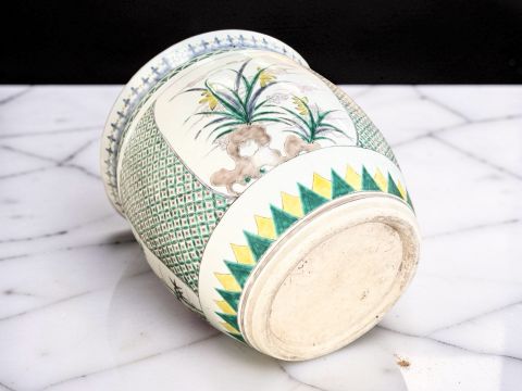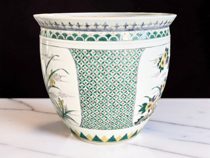 A Chinese famille verte porcelain jardinière, 20th century, decorated with Bamboo and other garden scene panels on a green geometric ground, height 37 cm.