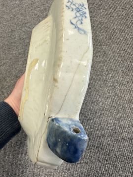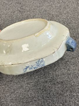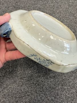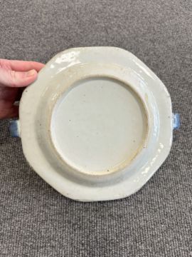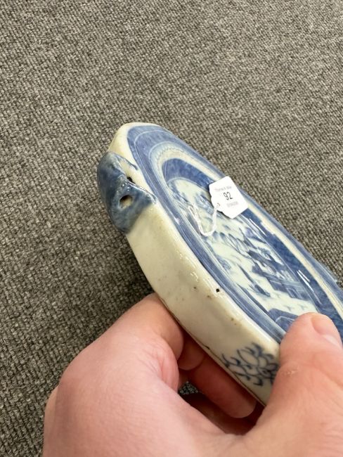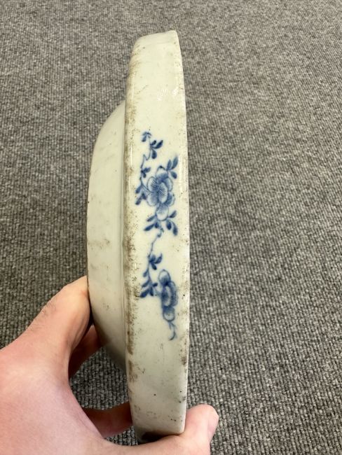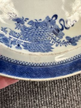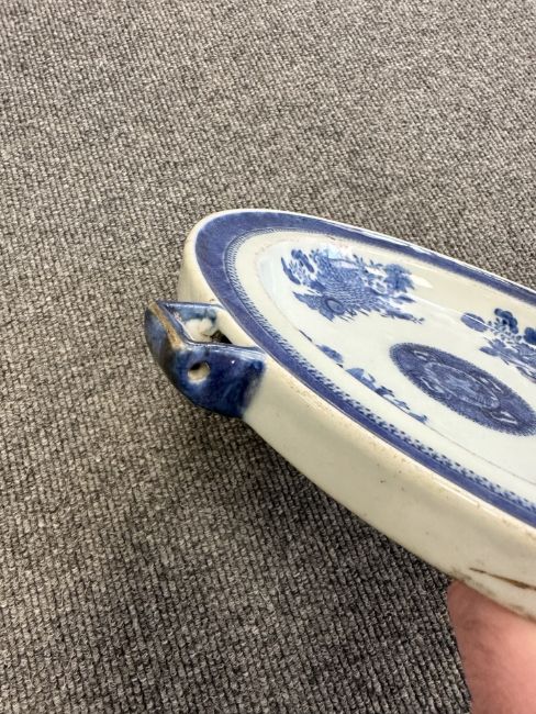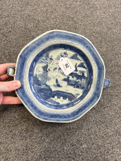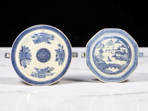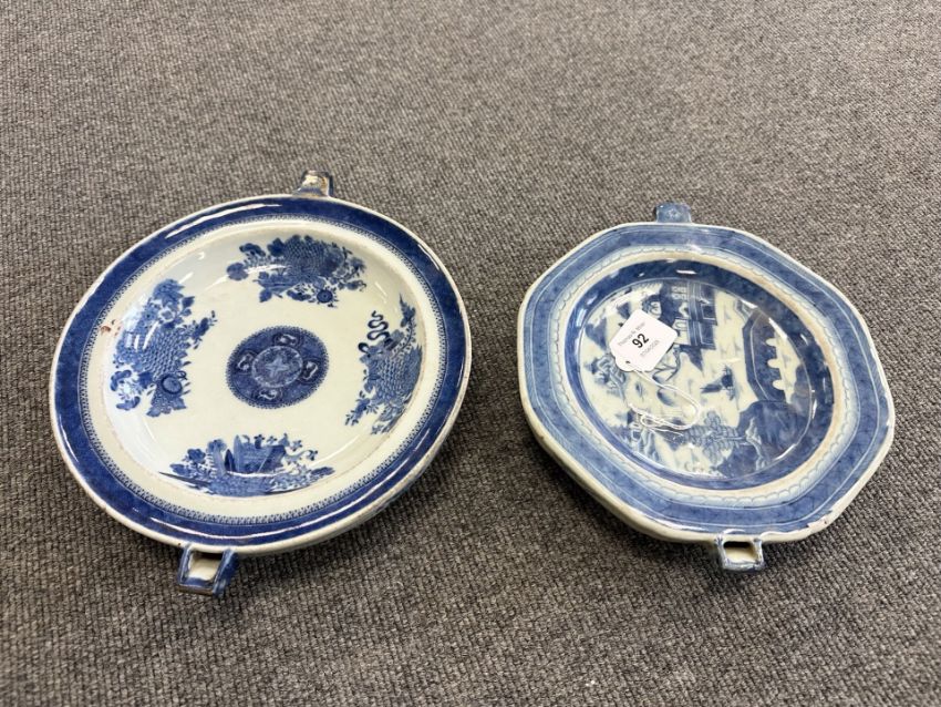 Two Chinese blue and white porcelain hot water dishes, Qianlong, 18th century, the largest 29 cm wide overall.