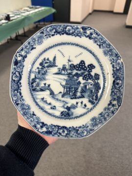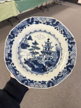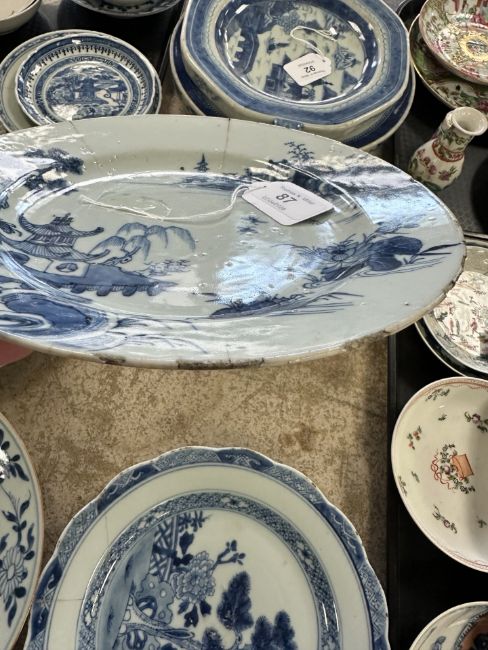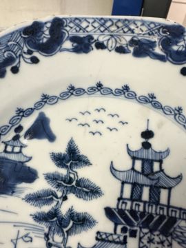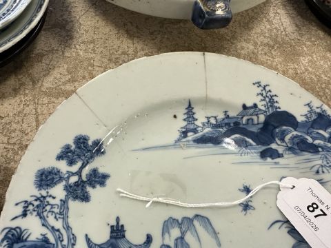 A Chinese blue and white porcelain plate, Qianlong, 18th century, depicting a view across a bay with traditional pagodas, diameter 22.5 cm, together with five further plates of similar period.