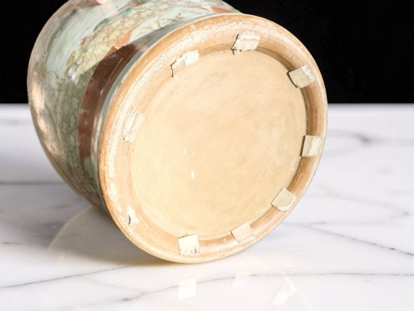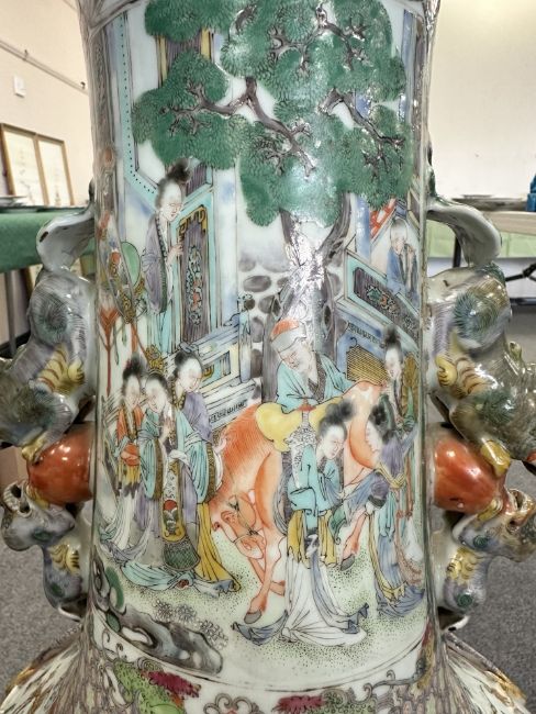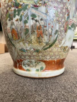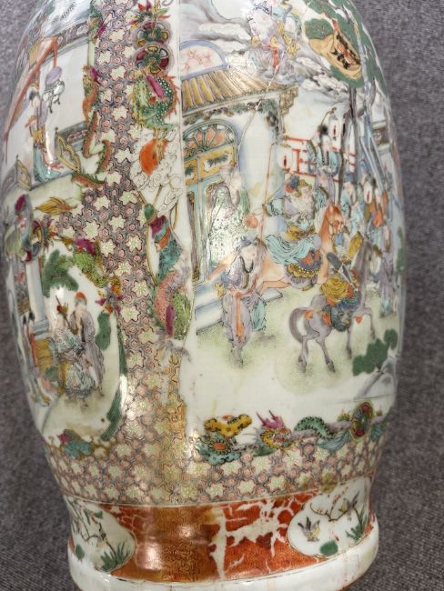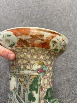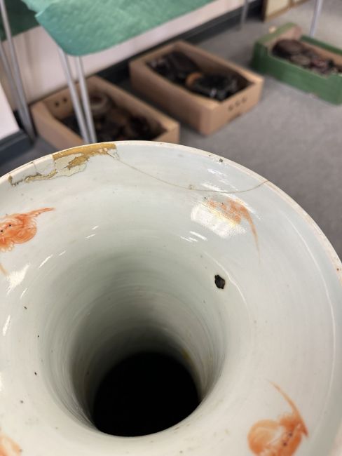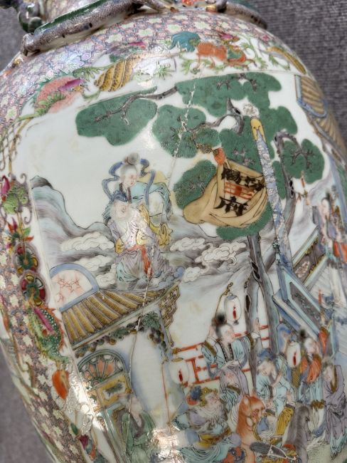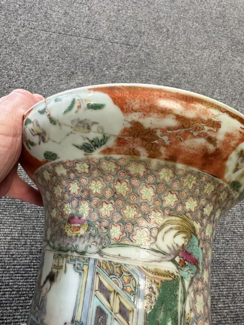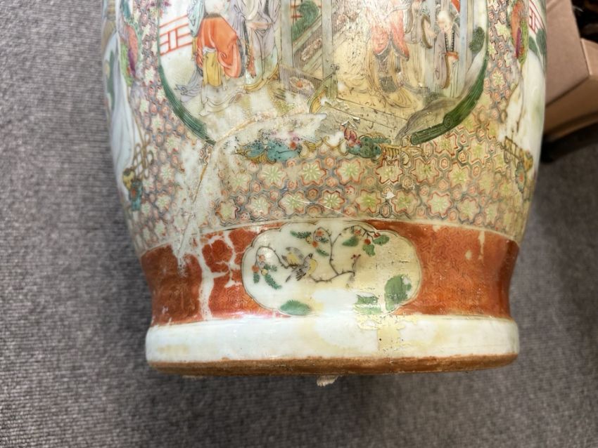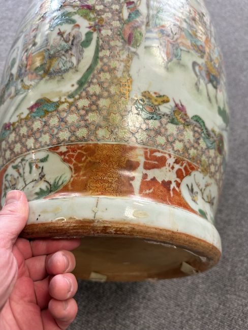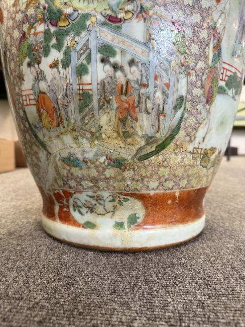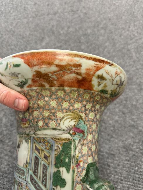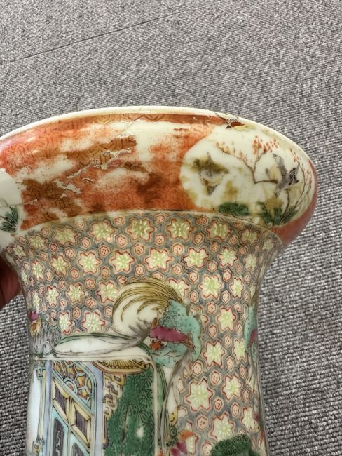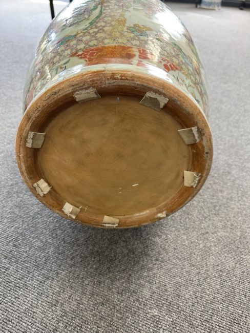 Prominent repairs through the body of the vase and down to the base, as well as the rim. See numerous additional images.