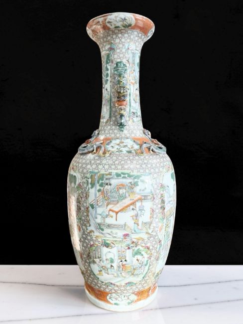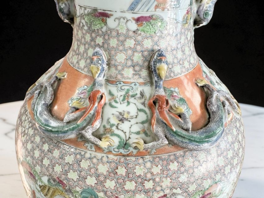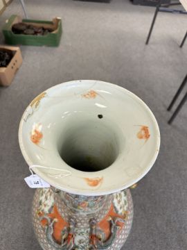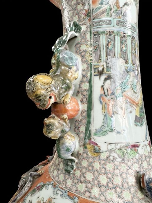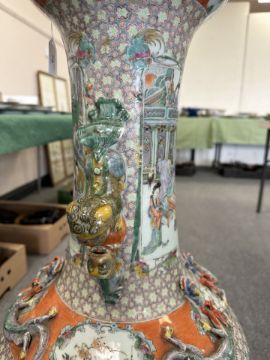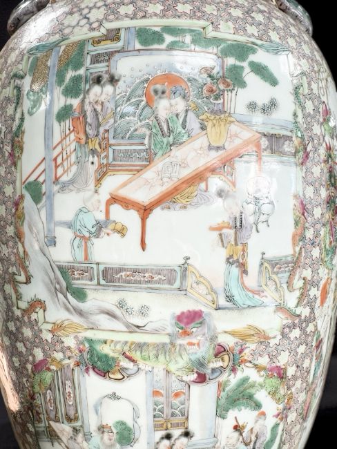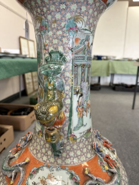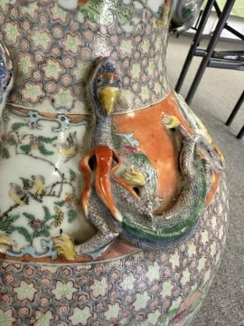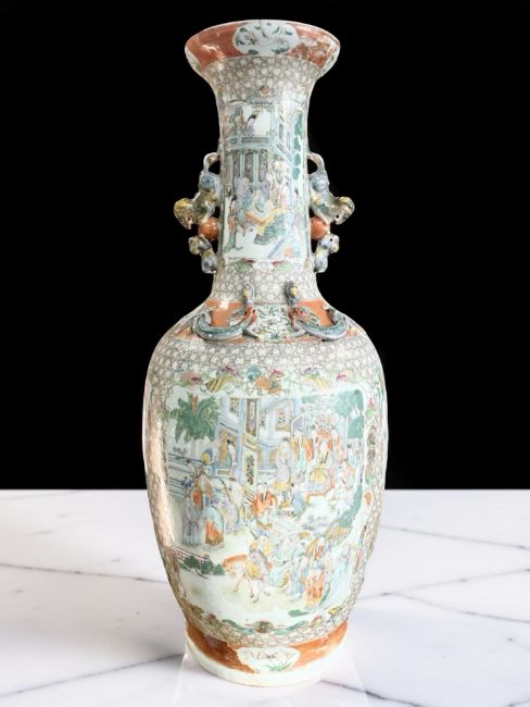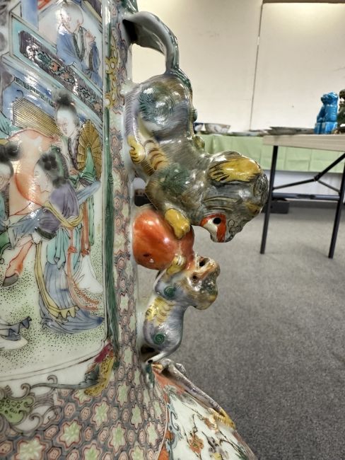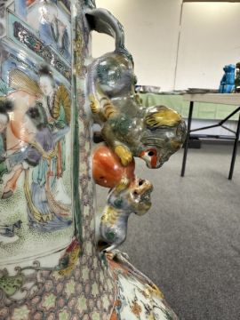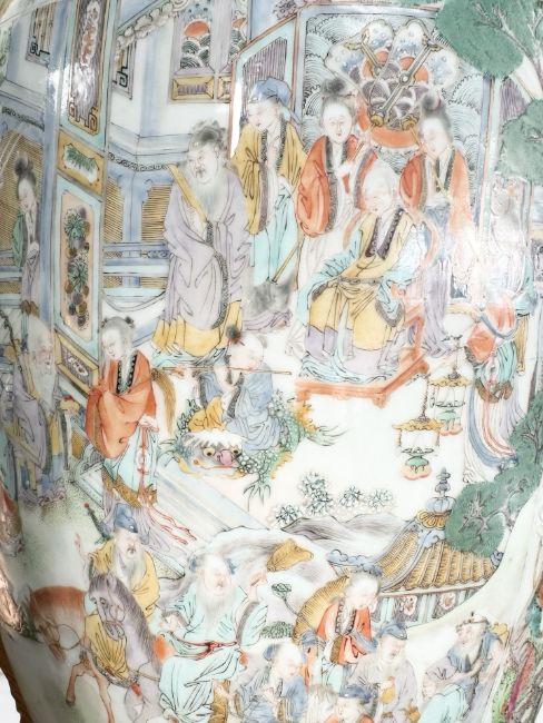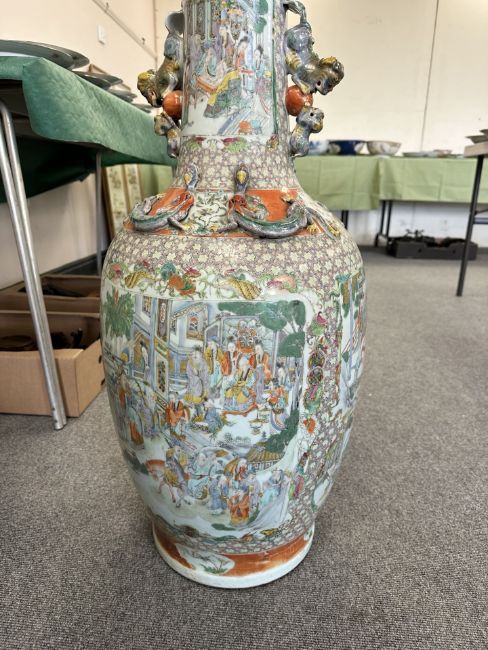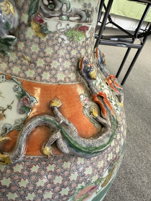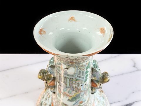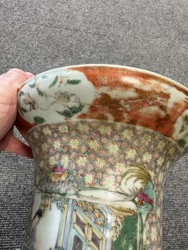 Prominent repairs through the body of the vase and down to the base, as well as the rim. See numerous additional images.