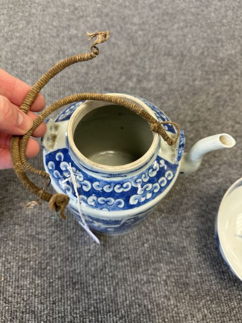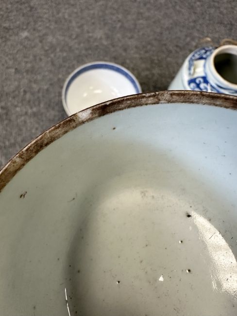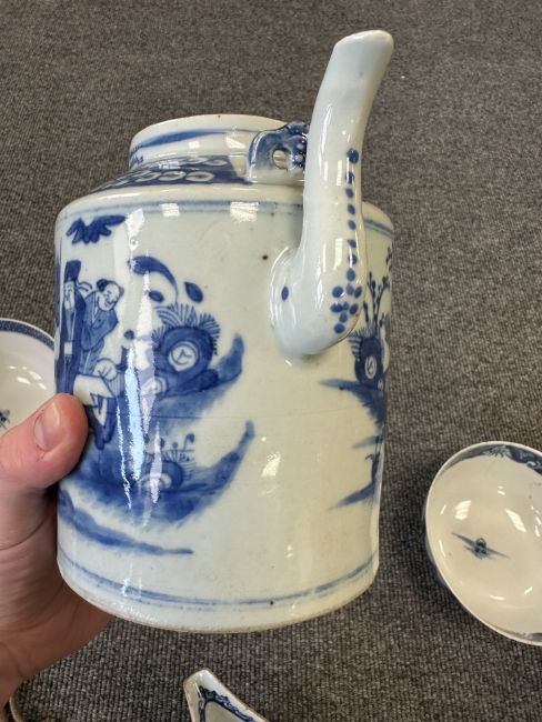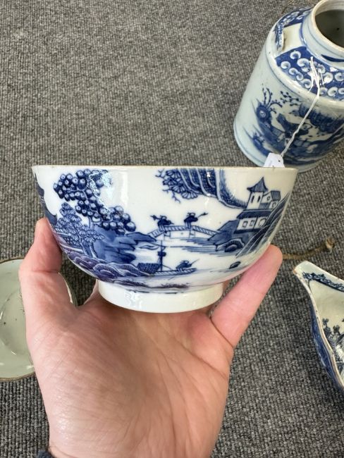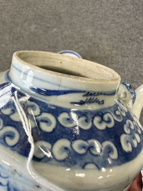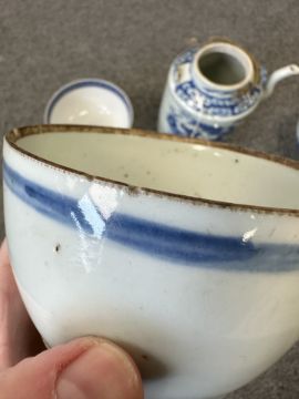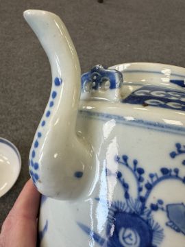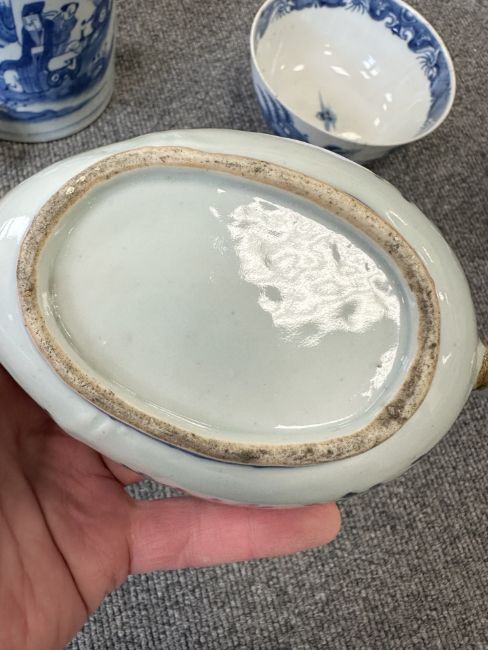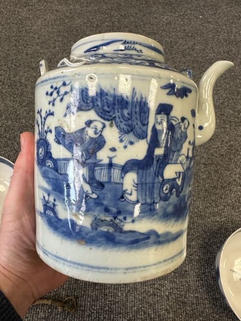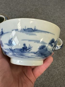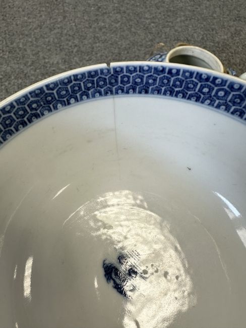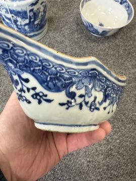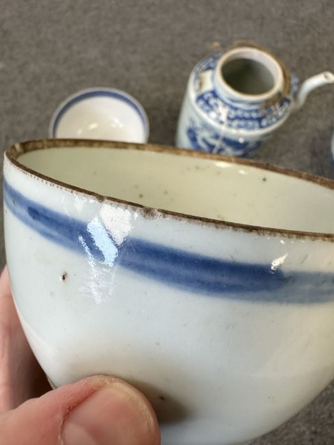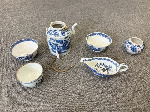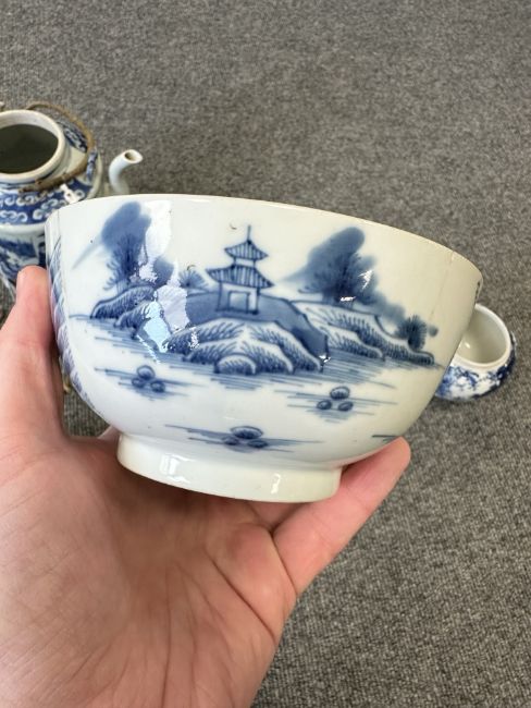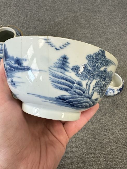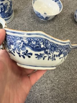 First bowl with several small chips to rim. Sauce boat with restored handle. Second bowl with small chip to rim and hairline crack. Third bowl with several hairline cracks. Pot with ring handles has one small chip to underside of foot but otherwise appears good. Teapot handle detached, hairline crack to rim, shallow chip to outer edge of foot. See numerous additional images.