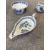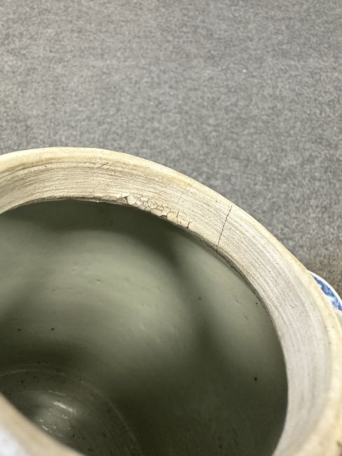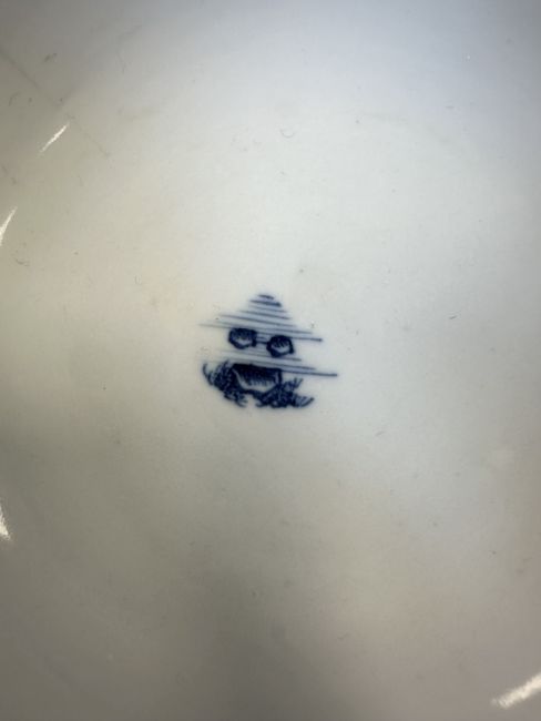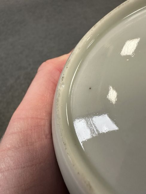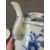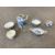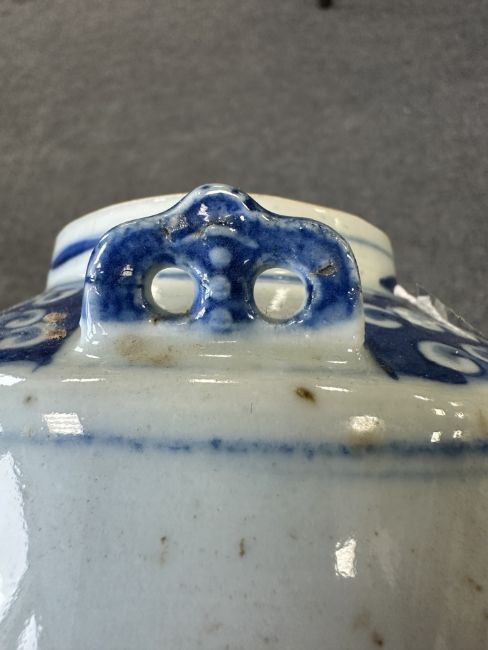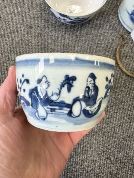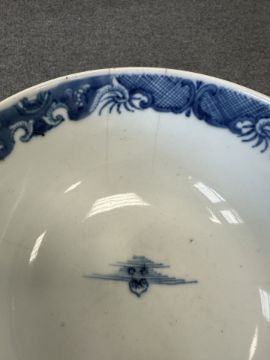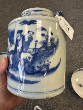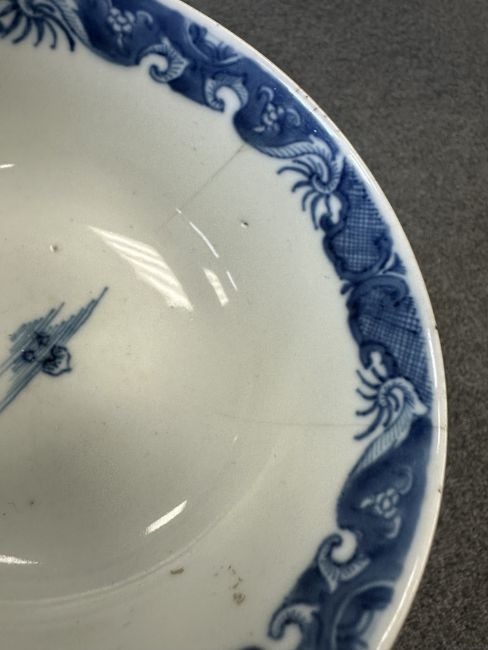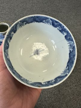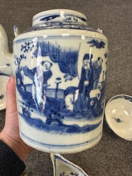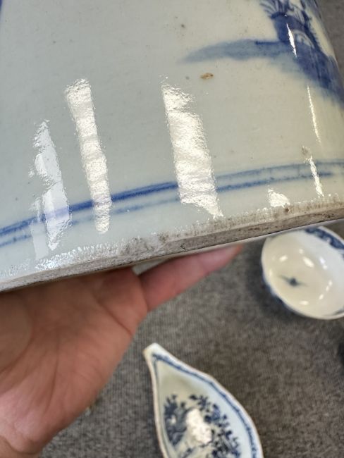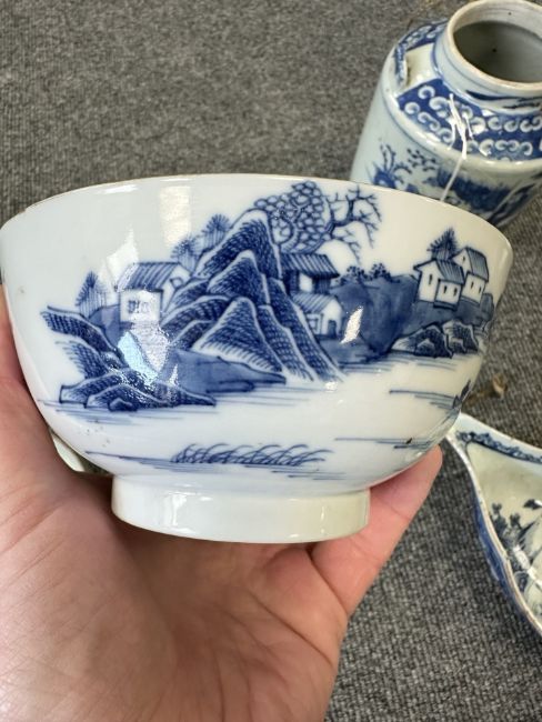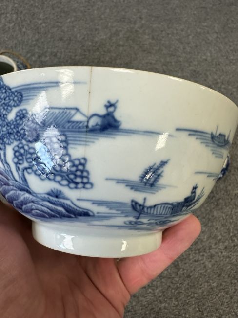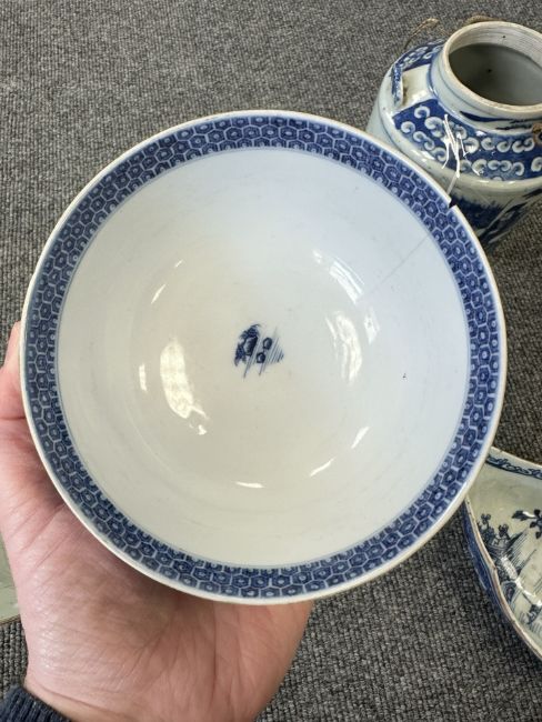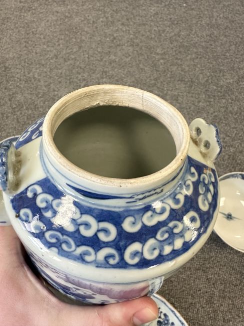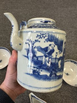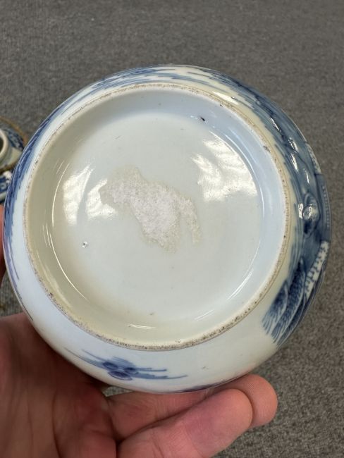 First bowl with several small chips to rim. Sauce boat with restored handle. Second bowl with small chip to rim and hairline crack. Third bowl with several hairline cracks. Pot with ring handles has one small chip to underside of foot but otherwise appears good. Teapot handle detached, hairline crack to rim, shallow chip to outer edge of foot. See numerous additional images.