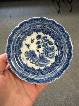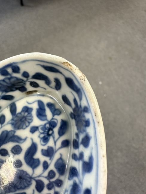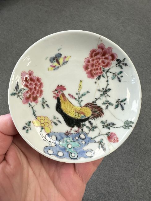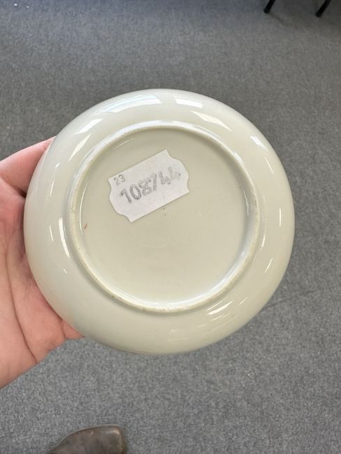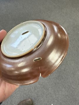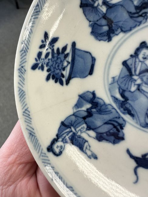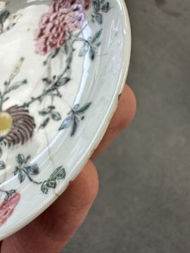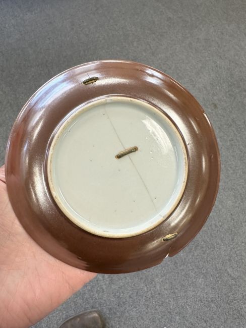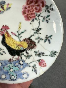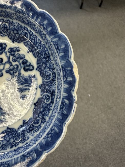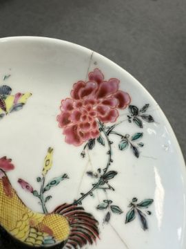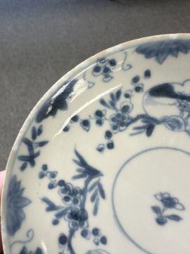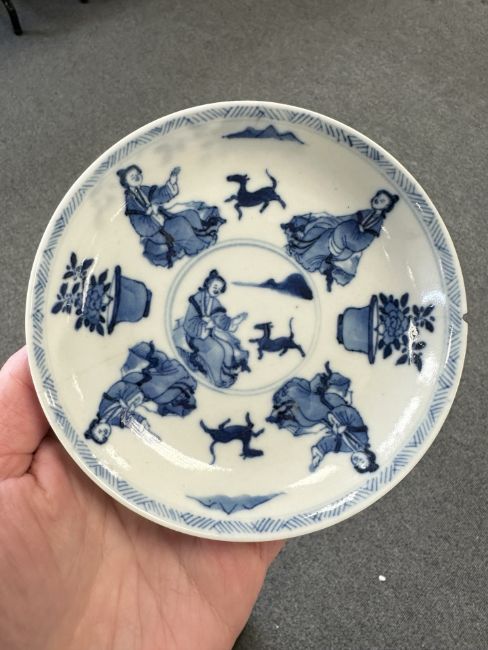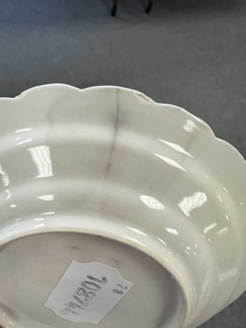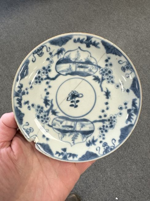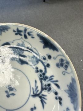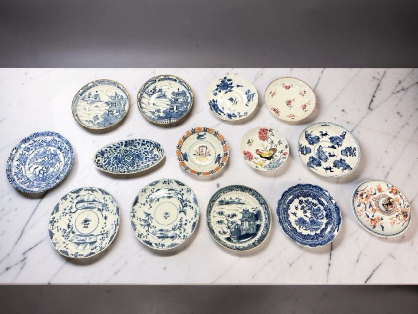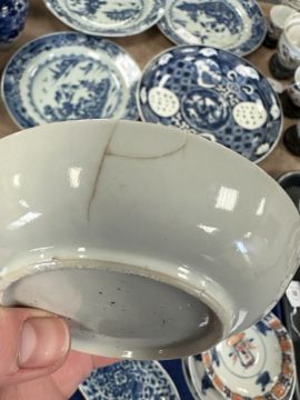 Lot is too large to comment accurately on condition. See numerous additional images where all pieces have been photographed several times. Virtually all pieces have historic hairline cracks and chips etc. Two have been stapled.