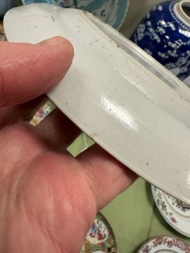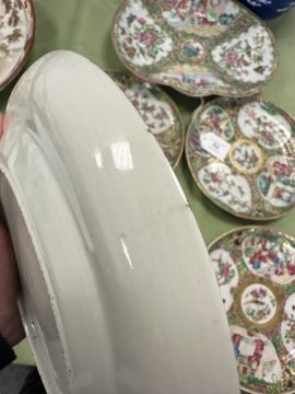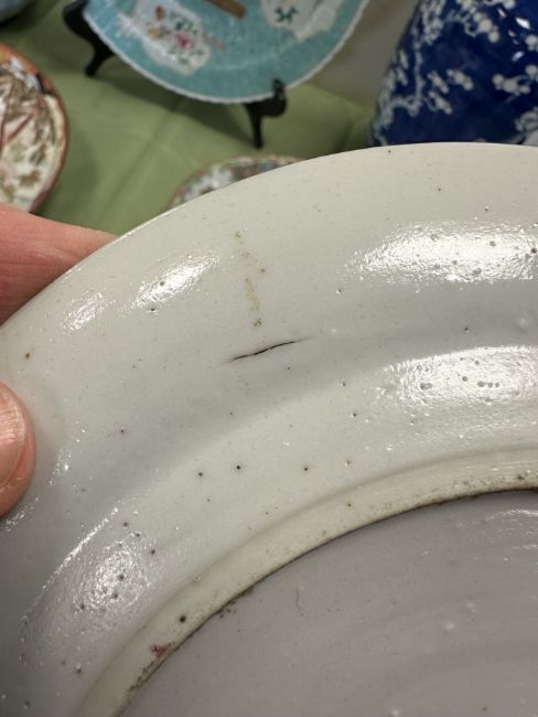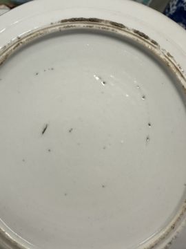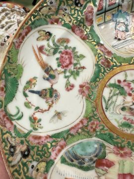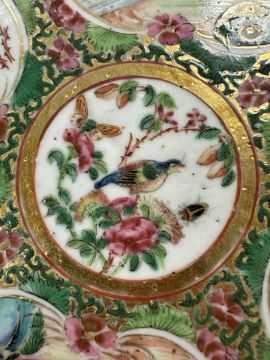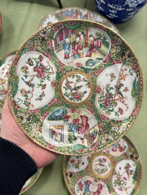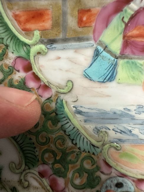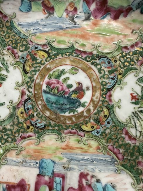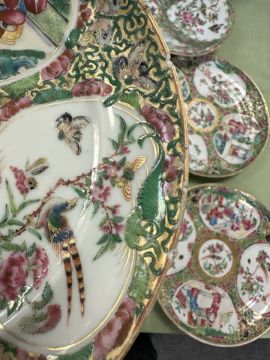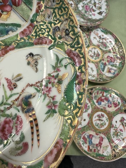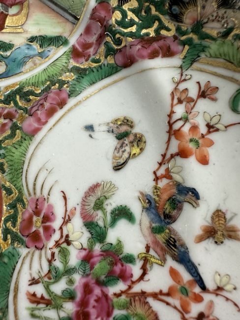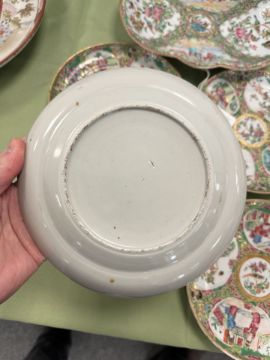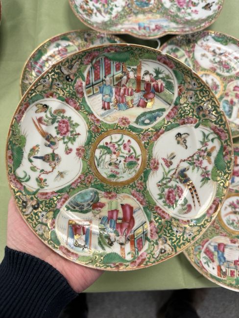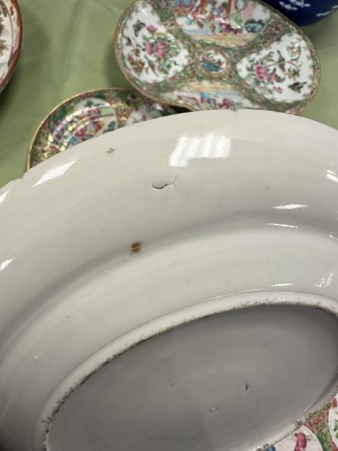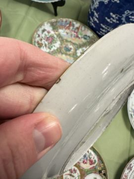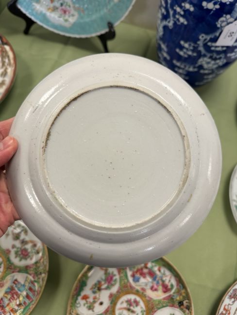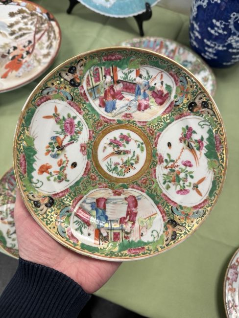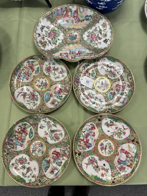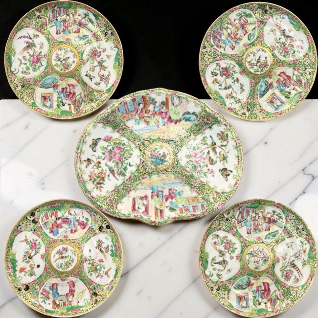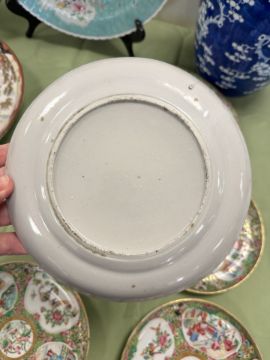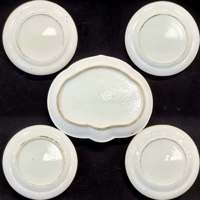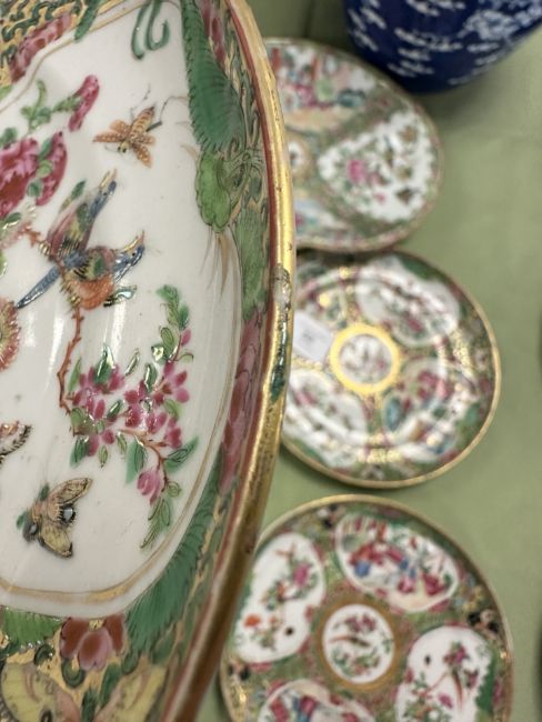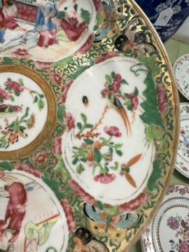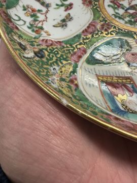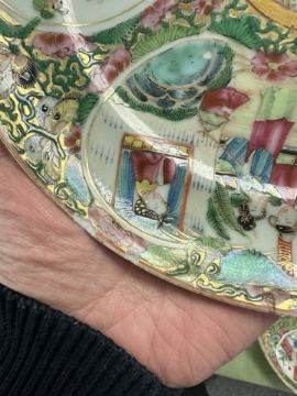 One circular plate with typical surface wear to the gilding but otherwise appears good. Three other circular plates in comparable condition but each with several old chips to the rims. Larger plate appears to be free from chips or cracks but does also have surface wear to the gilding, as well as small losses to the enamel. See numerous additional images.