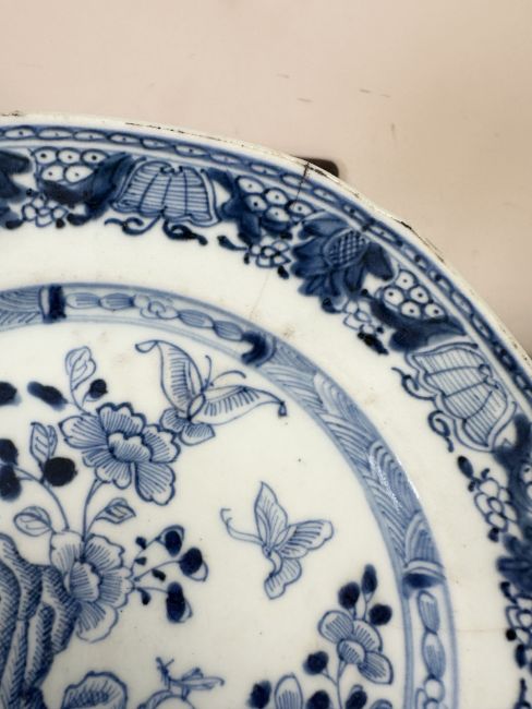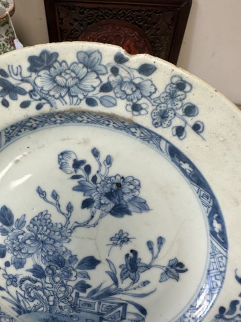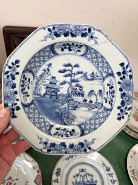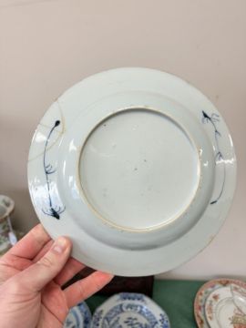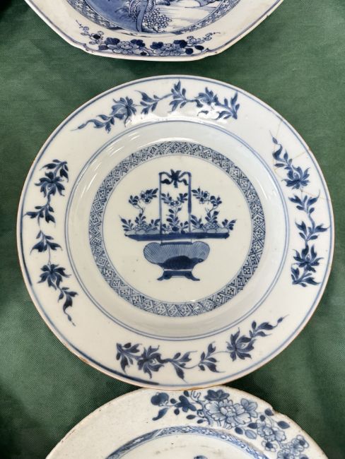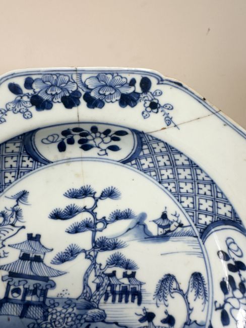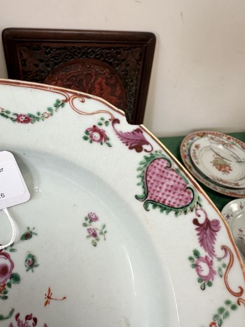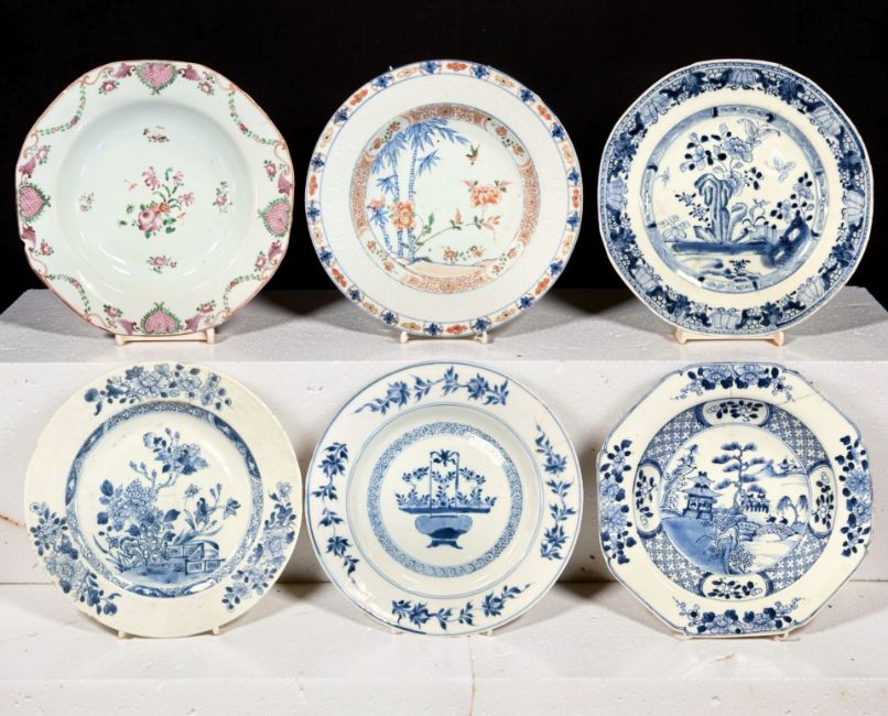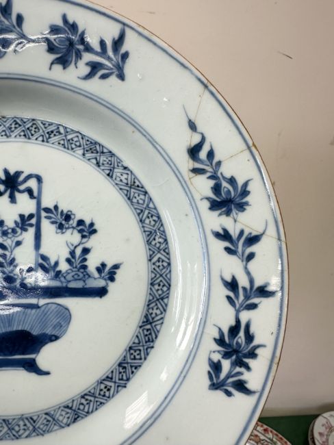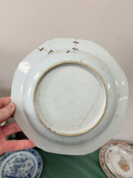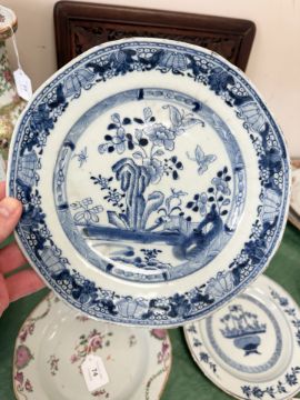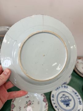 A Chinese Imari porcelain shallow bowl decorated with stalks of bamboo and chrysanthemum blossom, Qianlong, 18th century, diameter 23 cm, together with an octagonal famille rose bowl and four blue and white plates / bowls of similar period. * Provenance - The Michael Trethewey Collection, sold David Lay Auctioneers, 12th August 2021. CONDITION REPORT: All plates with imperfections, ranging from small historic chips, to large hairline cracks and old repairs. See numerous additional images.