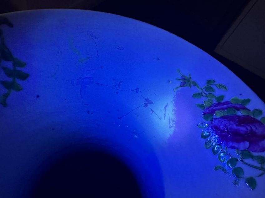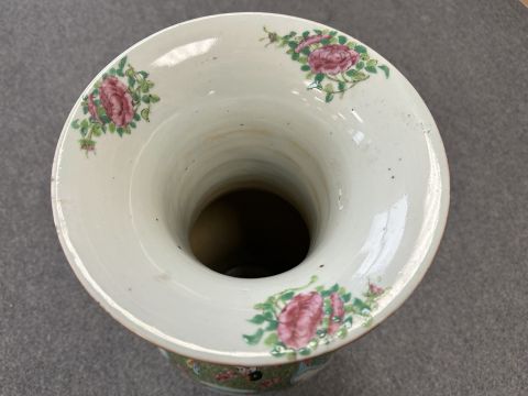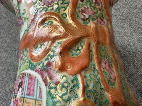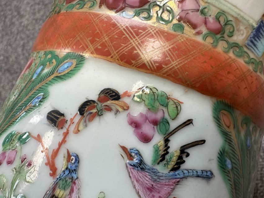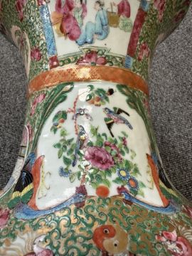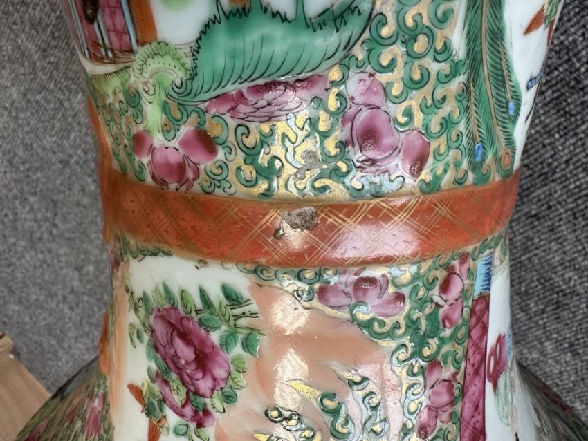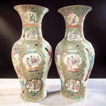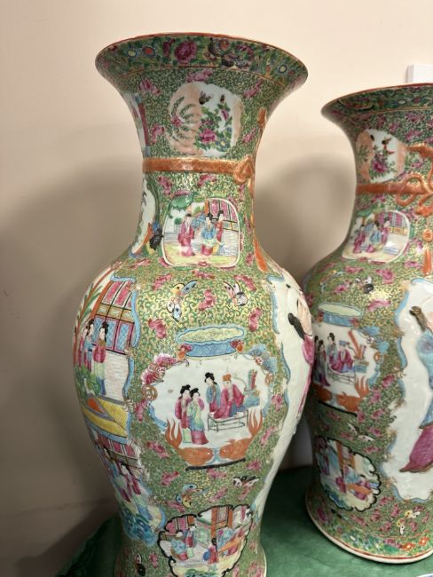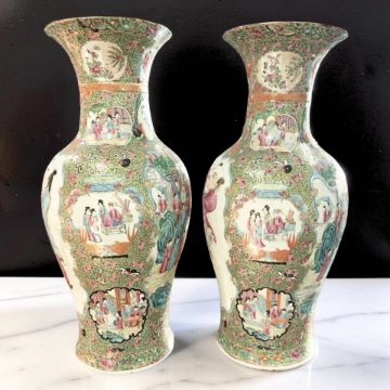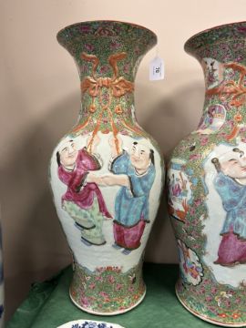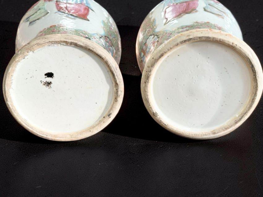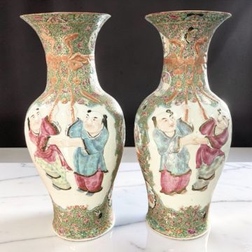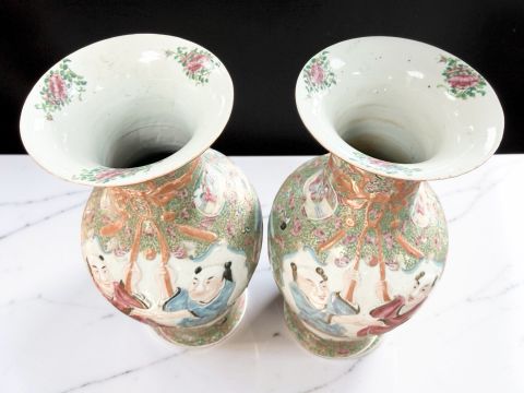 CONDITION REPORT UPDATED 02/04/2026 - Typical wear to the gilding and some areas of the enamelling. Short hairline crack visible on one vase running horizontally across the small sage green-coloured cloud-shaped panel above the figures. Another very faint hairline on the right shoulder of one of the boys. Small flaked chip to the red ribbon around the neck of one of the vases. The same ribbon has a small glazing bubble. A few minor flaked chips in various areas of the enamel. See numerous additional images. ADDITIONAL COMMENTS - One vase has a discrepancy in colour/glaze in two places around the inner rim. We have examined this under UV light (see final images) and we do not believe that the vase has been damaged. We believe another glazing coat has been applied to perhaps cover up scratches or deterioration of the glaze to the inner rim. We cannot see any evidence of cracks or breaks. There are some small spots of bright blue but these are glue residue from labels or tape and scratch off with a finger nail. There is no evidence of any repair or repainting on the exterior of the rim of the vase. We have tapped the rim of the vase all the way around and there is no discrepancy in sound produced by the porcelain.