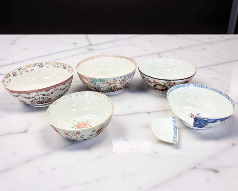 A Chinese famille rose porcelain punch bowl, Qianlong, 18th century, diameter 26.5 cm, together with four further bowls of similar period. * Provenance - The Michael Trethewey Collection, sold David Lay Auctioneers, 12th August 2021.