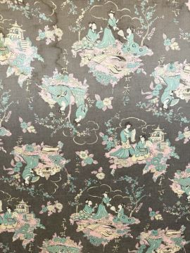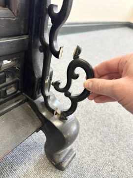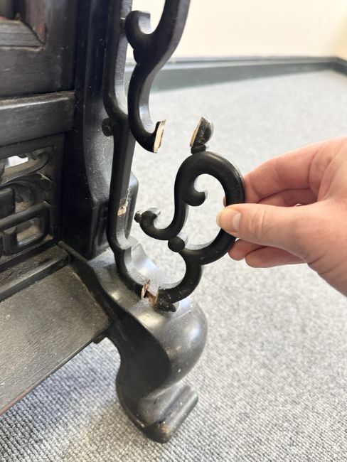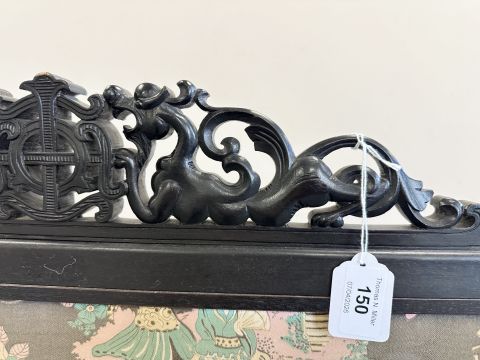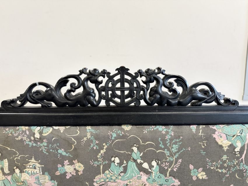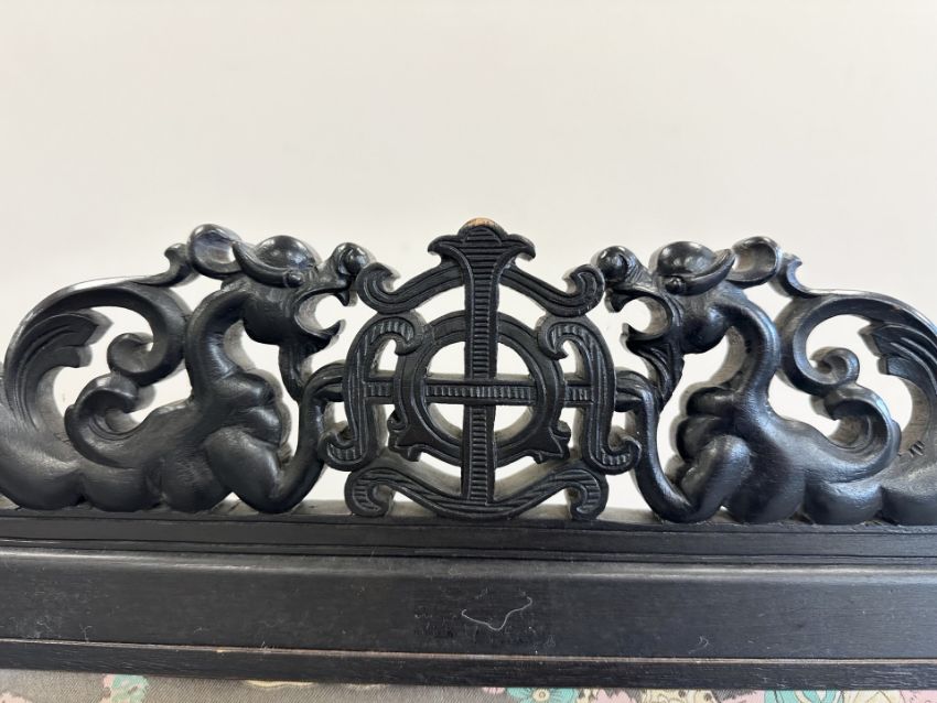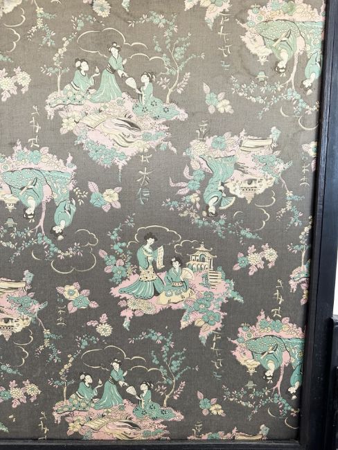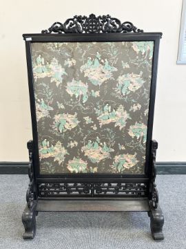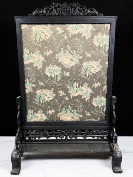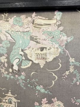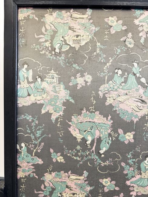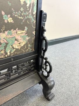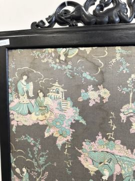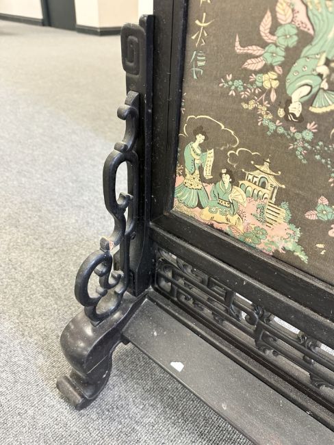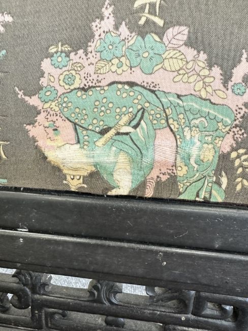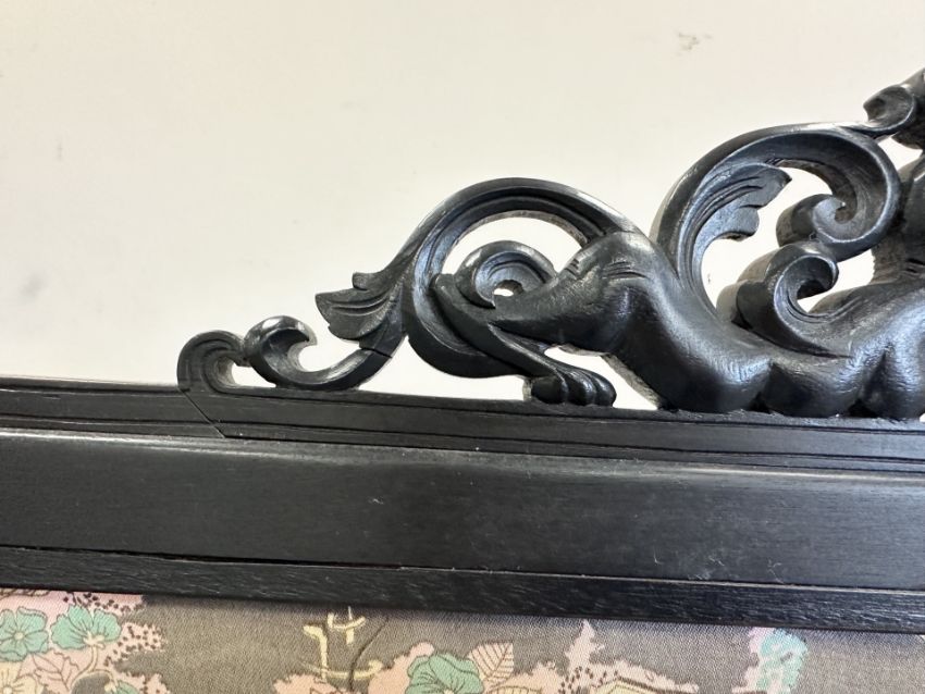 Section of carving broken off the frame but piece is present. Silk stretched in some areas. One side of silk with staining to upper left. Otherwise good condition. See additional images.